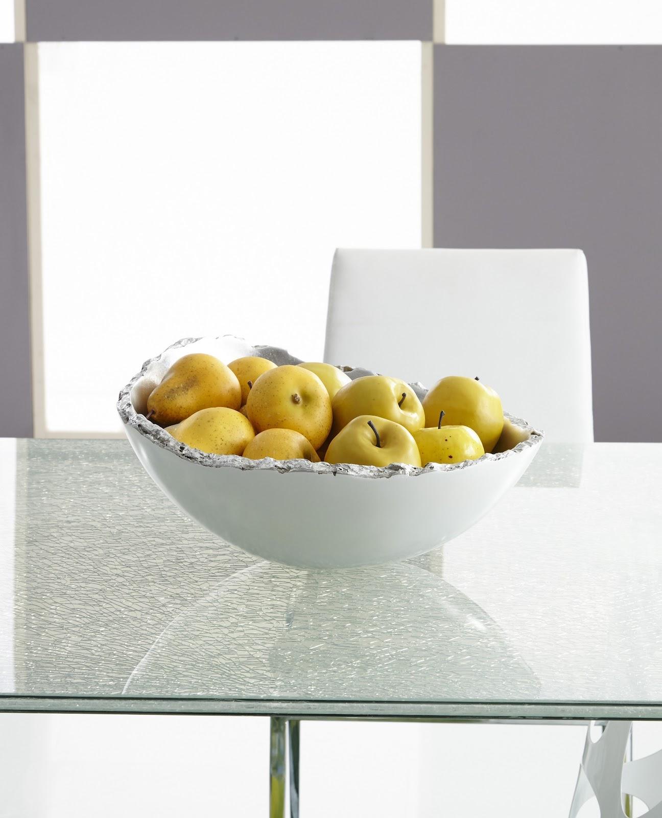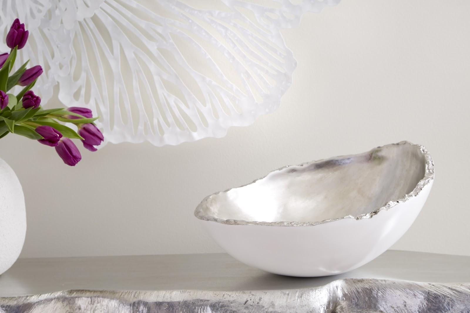 Description removeThe Broken Egg Shallow Silver Bowl is one of a number of products in the Broken Egg Collection of decorative accessories, furniture, and wall art, which was realized when Phillips Collection collaborated with the talented designer Dann Foley. Made of composite with a luminous silver leaf interior and pearl white exterior, this decorative bowl will shine from its spot in any room. Though it is a brilliant decorative bowl on its own, it is remarkably versatile: fill it with clear glass balls to create an elegant display atop a stack of coffee table books on a foyer table or a library shelf. Silver ornaments bring it a festive mood to make it perfect for holiday decor. We also offer the decorative bowl in a gold leaf version.Notice keyboard_arrow_downThe silver leaf finish applied to our products is known for its luxurious metallic appearance. However, this finish can be susceptible to scratching if not handled carefully. Silver leaf is a delicate material; abrasions may occur during routine use or contact with abrasive surfaces.