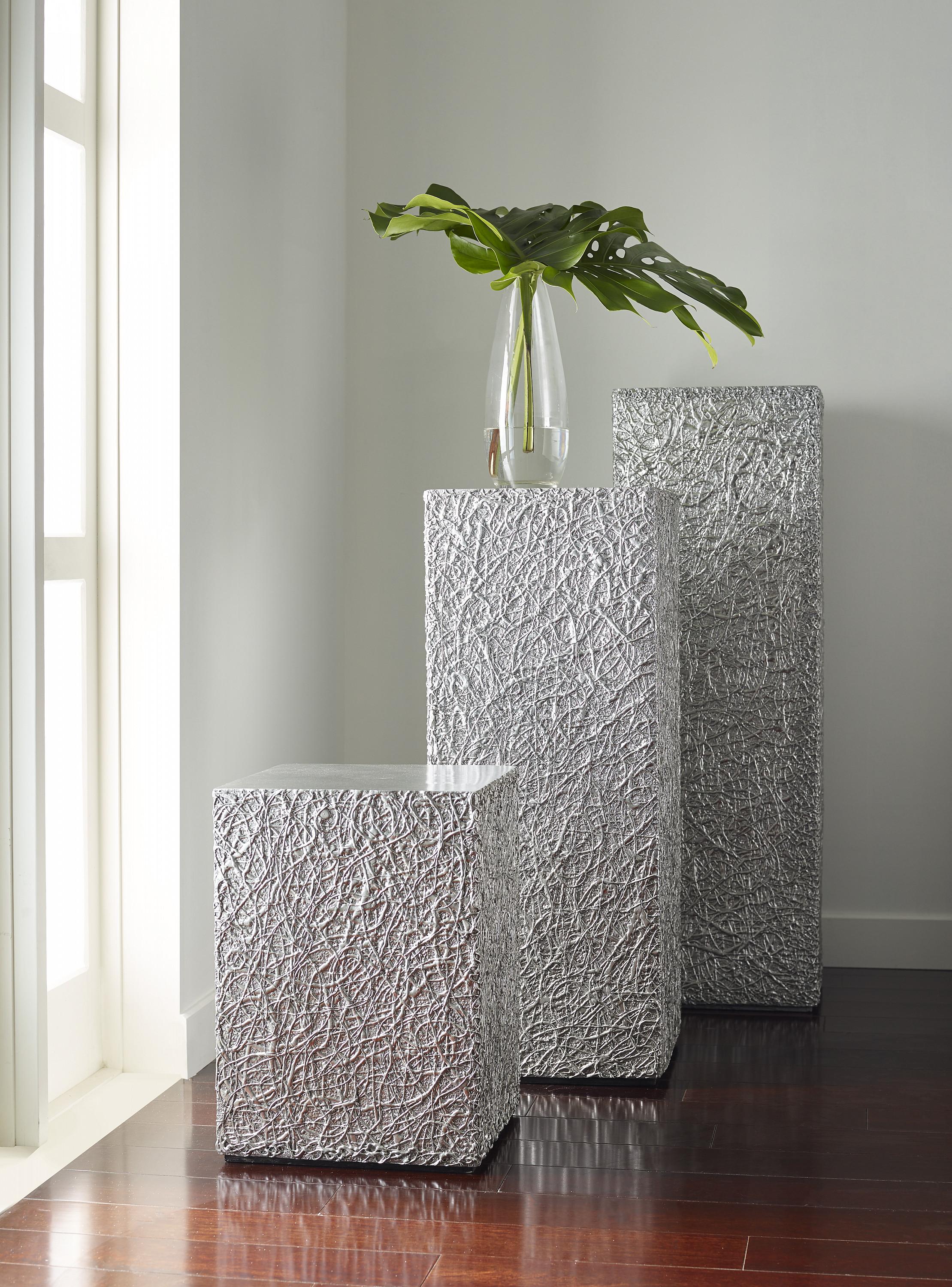 Description removeThe metallic finish on the String Theory Large Silver Pedestal convinces the eye that this decorative element is made of metal but it's fashioned from composite, which our talented finish artisans have given a gleaming sheen. This means it will far outlast any pedestal made from a material that could rust. The combination of its bright surface and textural pattern makes this piece a shoe-in for the Phillips Collection ethos, which we call modern organic. We offer several finishes and sizes of this design; and we have planters in several finishes.Notice keyboard_arrow_downThe silver leaf finish applied to our products is known for its luxurious metallic appearance. However, this finish can be susceptible to scratching if not handled carefully. Silver leaf is a delicate material; abrasions may occur during routine use or contact with abrasive surfaces.