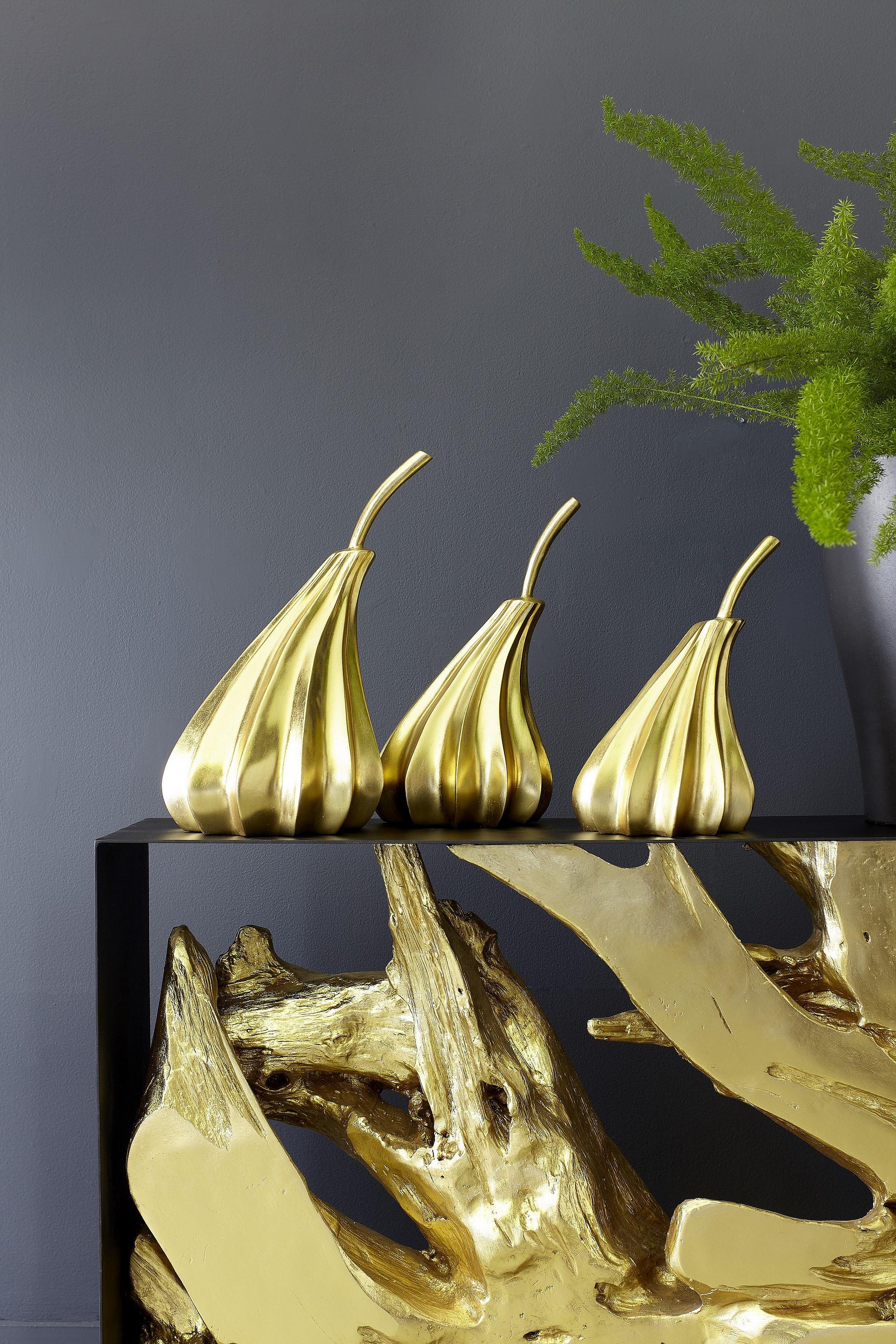 Description removeThese decorative sculptures not only shine, but they will also bring a hint of whimsy to a space thanks to their profiles that seem to be frozen in dance. There are three of Hand-Dipped Gold Pears in this set, each of which is made of composite in a bright gold leaf finish. The contemporary lines and unusual slant reflect the Phillips Collection ethos, which we call modern organic. We offer these decorative accessories in several finishes.Notice keyboard_arrow_downThe gold leaf finish applied to our products is known for its luxurious metallic appearance. However, this finish can be susceptible to scratching if not handled carefully. Gold leaf is a delicate material; abrasions may occur during routine use or contact with abrasive surfaces.