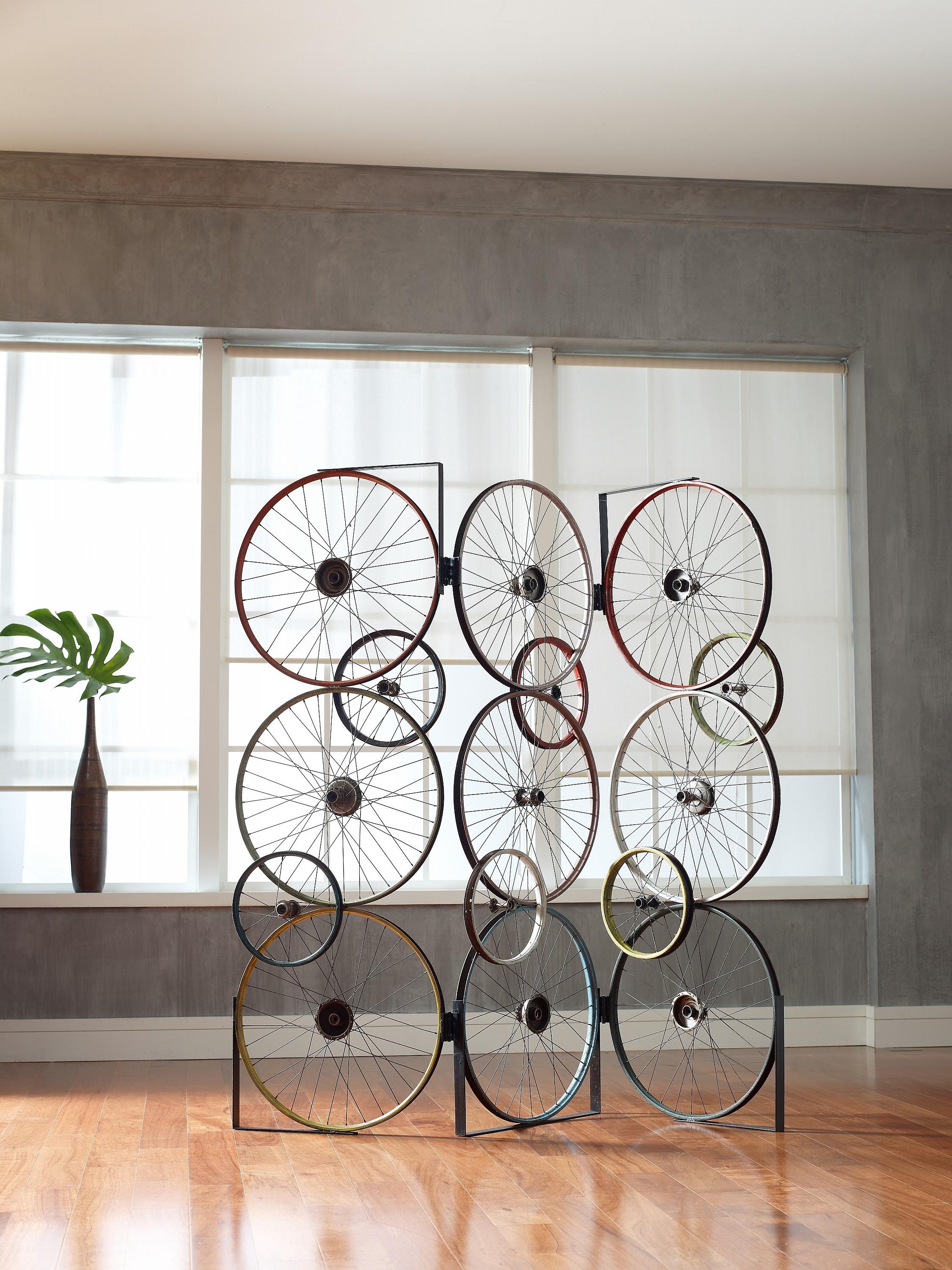 Description removeBicycles are everywhere in Indonesia. When they break or are abandoned, we turn pieces of them into furniture and accessories, like our Assorted Bicycle Wheel Screens, to give them life again. By recycling what would end up being tossed to create wall art with an edgy vibe, we've made the metal room screens the perfect representations of the Phillips Collection ethos, which we call modern organic. Because no two are exactly alike, whichever you choose is uniquely yours.Notice keyboard_arrow_downCrafted from reclaimed bicycles, these pieces may vary in style from the different parts that have been repurposed. Color may vary slightly from piece to piece.