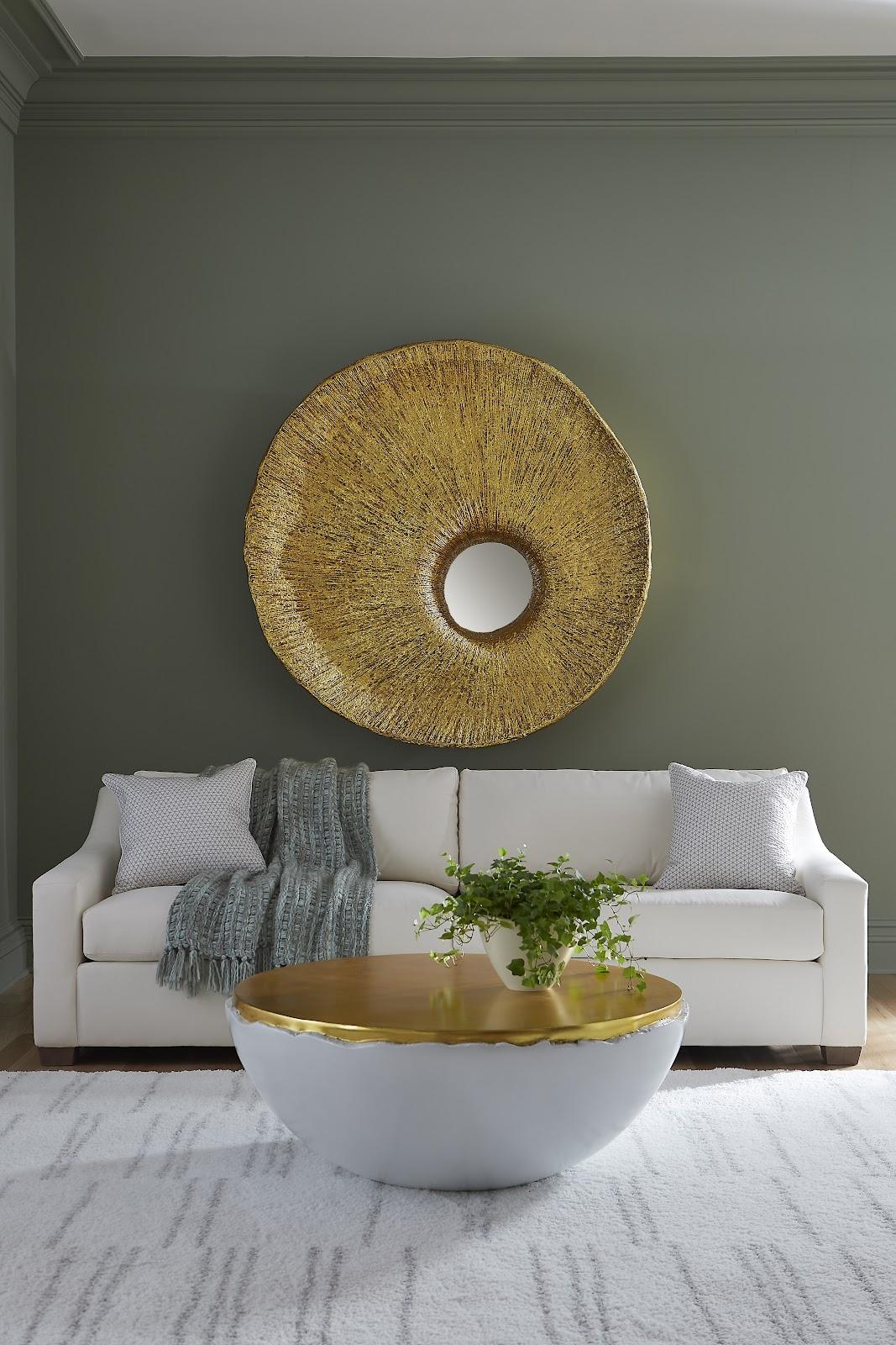 Description removeThe Broken Egg Coffee Table is one of a number of products in the Broken Egg Collection of decorative accessories, furniture, and wall art, which was realized when Phillips Collection collaborated with the talented designer Dann Foley. Made of composite with a luminous gold leaf top, the fluted edge of the pearl white exterior is a design move of note, as it cleverly imitates the furrowed edges on the decorative bowls, vase, mirrors, and wall art. The dash of whimsy that this design detail brings to this gold coffee table adds personality to the clean contemporary style of the piece without interrupting its modern lines.Notice keyboard_arrow_downThe gold leaf finish applied to our products is known for its luxurious metallic appearance. However, this finish can be susceptible to scratching if not handled carefully. Gold leaf is a delicate material; abrasions may occur during routine use or contact with abrasive surfaces.