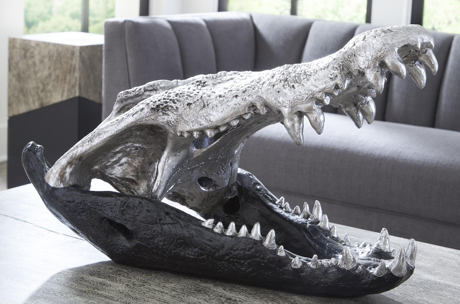 Description removeThe Crocodile Skull Silver Sculpture brings a room all of the exoticism the big game hunter has been afforded throughout history without having to spend time schlepping through the Everglades! Plus, there’s no guilt for the non-hunter with our toothy silver and black sculpture, as it is made of composite in silver and black finishes. We’ve added a hint of glint to this jaw-dropping decorative accent by covering the crocodile’s teeth and snout in silver leaf. We also offer this sculpture in a Roman stone and gold/black versions. Each of these decorative accessories reflects the ethos that Phillips Collection personifies: modern organic.Notice keyboard_arrow_downThe silver leaf finish applied to our products is known for its luxurious metallic appearance. However, this finish can be susceptible to scratching if not handled carefully. Silver leaf is a delicate material; abrasions may occur during routine use or contact with abrasive surfaces.