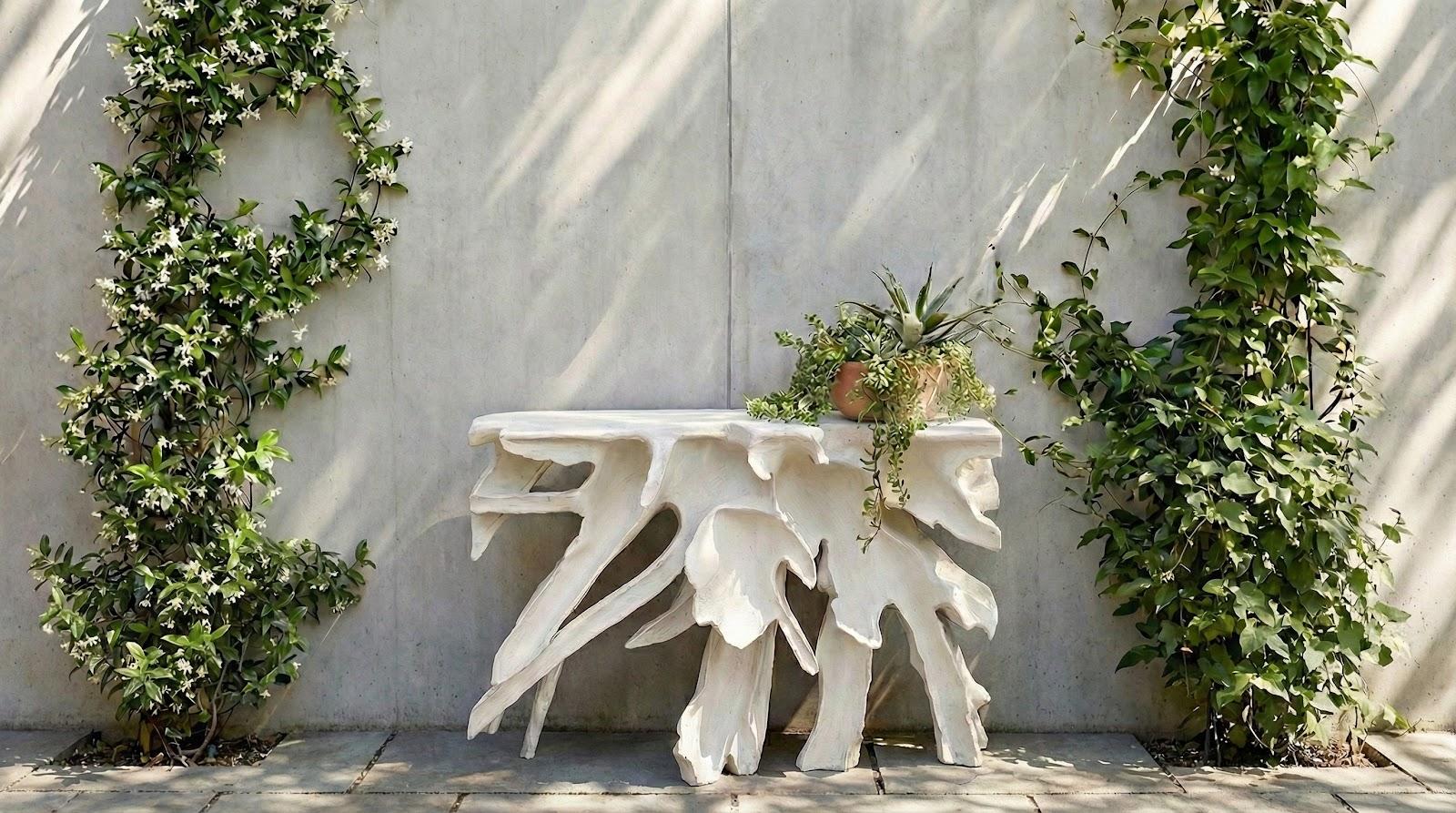 Description removeThe Cast Naturals Collection highlights our skills at taking an innovative material and making it feel as if it sprang from Nature. The Cast Teak Root Console Table is made of composite that has been molded to look like a piece of harvested wood that took nature eons to create, then finished in White Stone. The advantage of having a console table made from this durable material is that it will long outlast its natural counterparts pulled from the forest floor.Notice keyboard_arrow_downOur White Stone finish is crafted using a unique blend of crushed stone and resin, backed by a durable fiberglass structure. As a result of this artisanal process, hairline cracks may naturally appear in the surface. These fine lines are an expected characteristic of the material and do not compromise the strength, stability, or structural integrity of the piece. They are not considered defects or damage. Each item reflects the handcrafted nature of the White Stone finish, adding to its individual charm and timeless appeal.