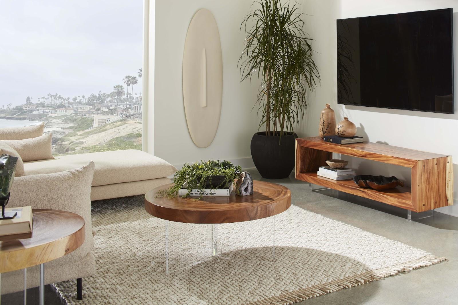 Description removeWith acrylic legs that all but disappear, the plank top of our Floating Round Natural Coffee Table seems to levitate. Made of chamcha wood that we have left natural, the top has tremendous personality given the beautiful color gradations in the woodgrain, which has a textural complexity to it.Notice keyboard_arrow_downThis piece is crafted from natural solid wood. Color and character of wood grain may vary and natural cracks and holes may be present adding a unique character to your piece.