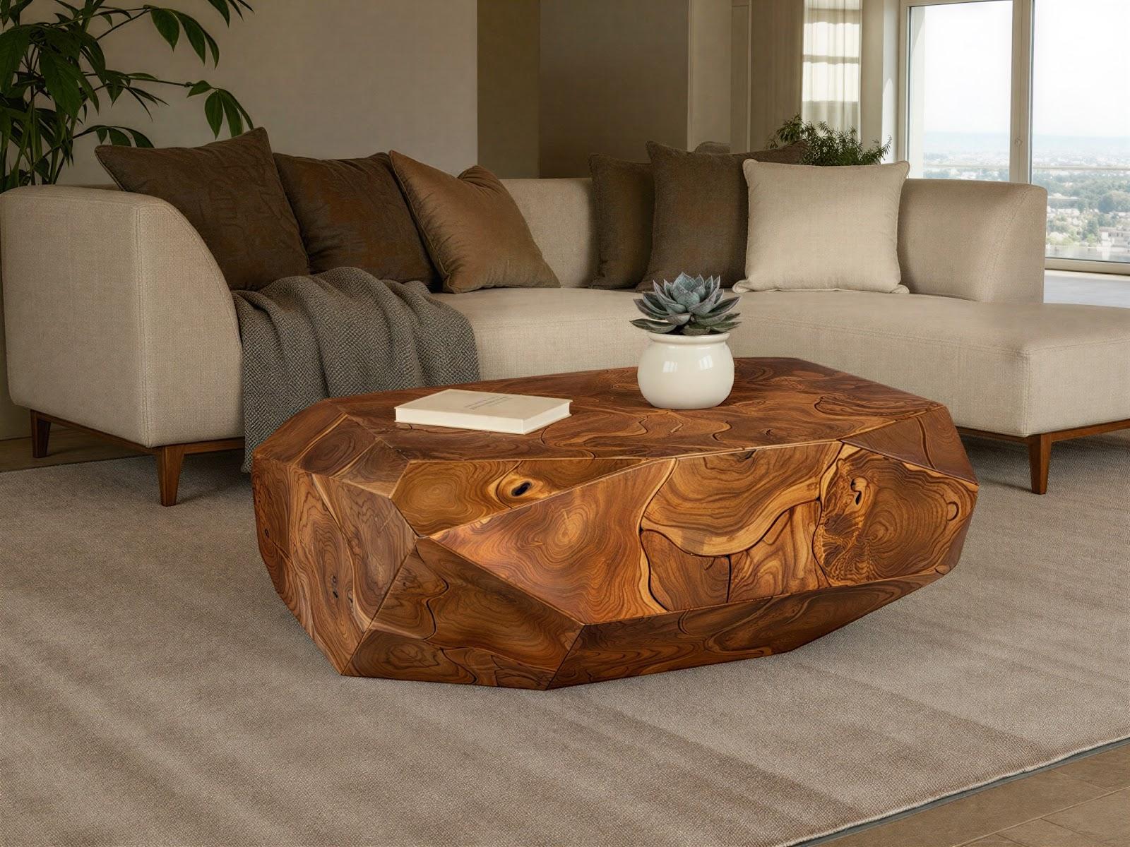 Description removeA striking blend of nature and design. Crafted from solid teak wood with a natural finish, the Prism Coffee Table highlights the beauty of organic materials in a bold, geometric form. A statement piece that brings warmth and character to any space.Notice keyboard_arrow_downThis piece is crafted from natural solid wood. Color and character of wood grain may vary, adding a unique character to your piece.
