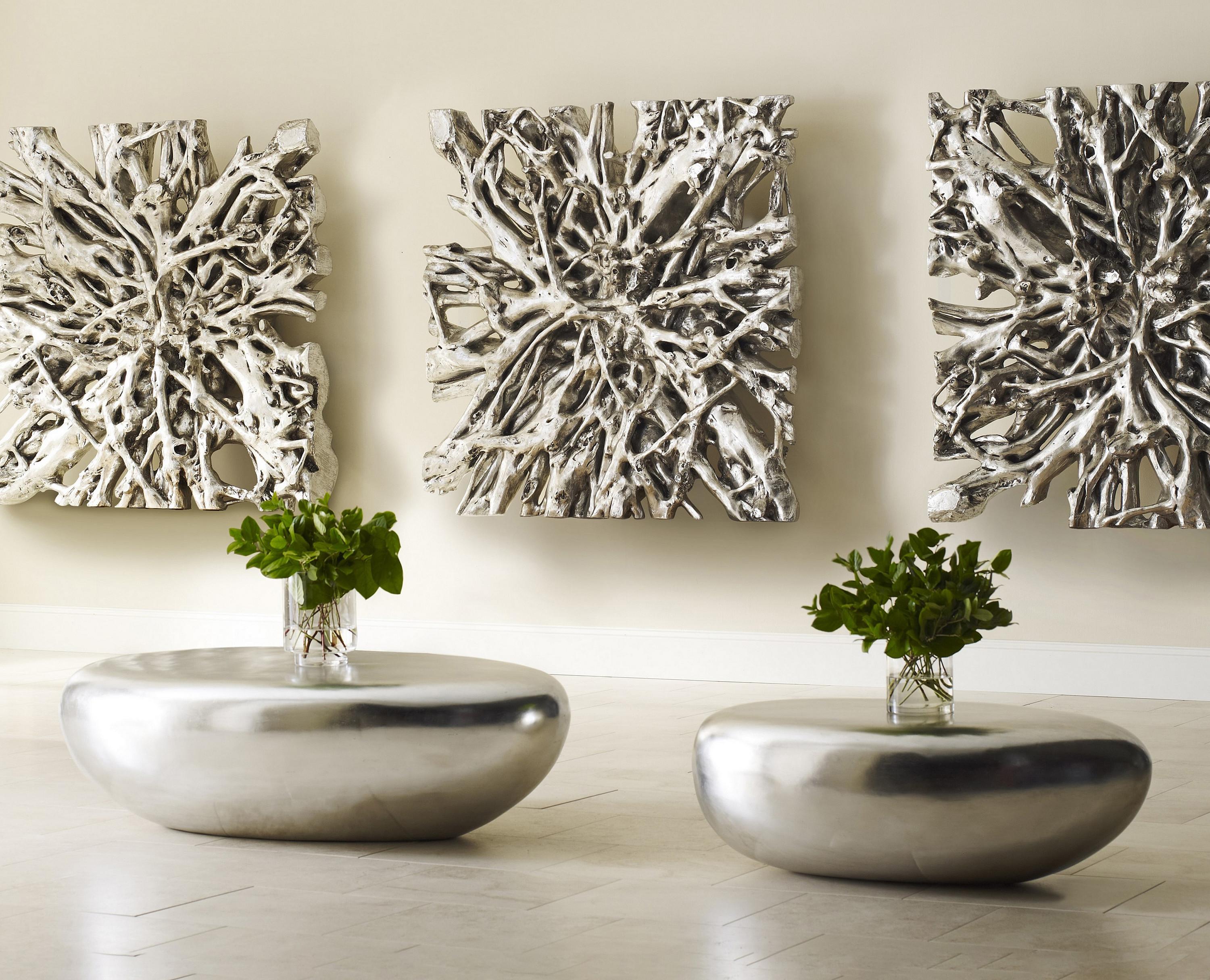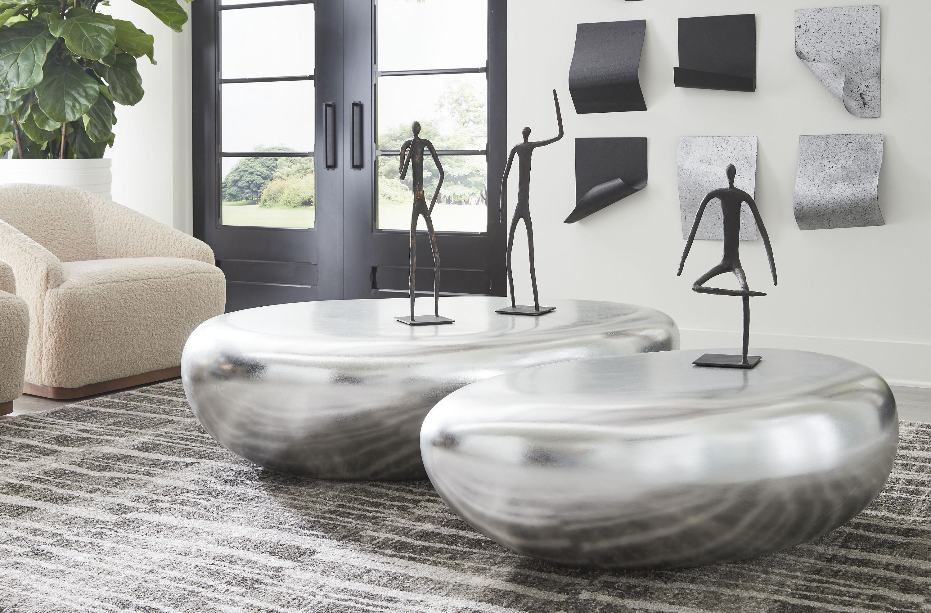 Description removeThere is something mesmerizing about the power of water and how it softens rock into a water-worn stone. Designer Jason Phillips found inspiration in Nature's ability to shape a hard surface into something beautiful when he envisioned the River Stone collection, which includes the River Stone Large Silver Coffee Table. With no harsh lines or hard edges, there is no need to worry about bruised shins and bumped heads given the delicate outline of these stunningly simple pieces. Made of composite in a brilliant silver leaf finish, this rock-shaped coffee table with its flat top, which is highly functional, is one of many products we offer in this collection, each of which reflects the ethos that Phillips Collection personifies: modern organic.Notice keyboard_arrow_downThe silver leaf finish applied to our products is known for its luxurious metallic appearance. However, this finish can be susceptible to scratching if not handled carefully. Silver leaf is a delicate material; abrasions may occur during routine use or contact with abrasive surfaces.