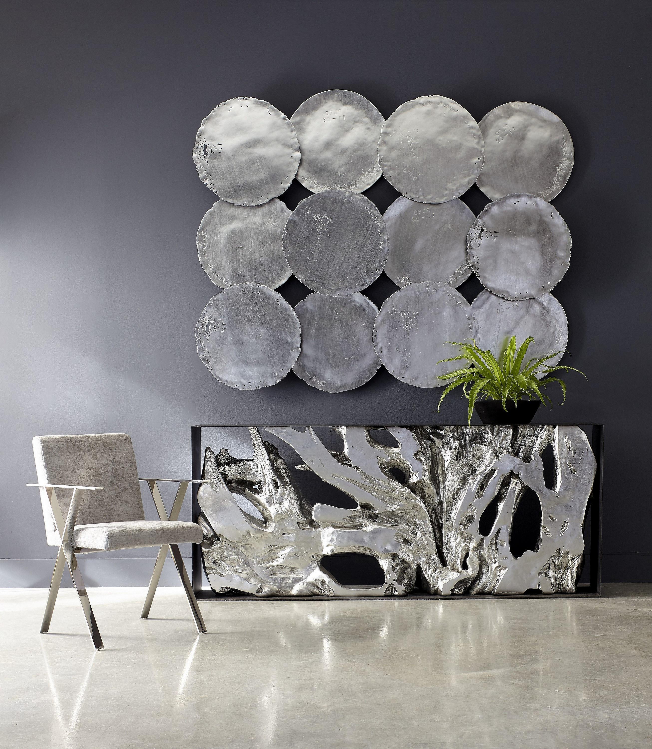 Description removeWhen we saw how dynamic our framed natural wood consoles looked, we knew it was time to cast a beautiful piece of teak root from composite and encase it in iron. Both sides of the Cast Root Framed Silver Console Table are finished and unique so you can place it so it's seen from both sides. This version of the root console table is in a silver leaf finish that will bring ample bling to a space. We also offer it in a brown/black finish and in gold leaf, each of which is the perfect representation of the Phillips Collection ethos: modern organic.Notice keyboard_arrow_downThe silver leaf finish applied to our products is known for its luxurious metallic appearance. However, this finish can be susceptible to scratching if not handled carefully. Silver leaf is a delicate material; abrasions may occur during routine use or contact with abrasive surfaces.