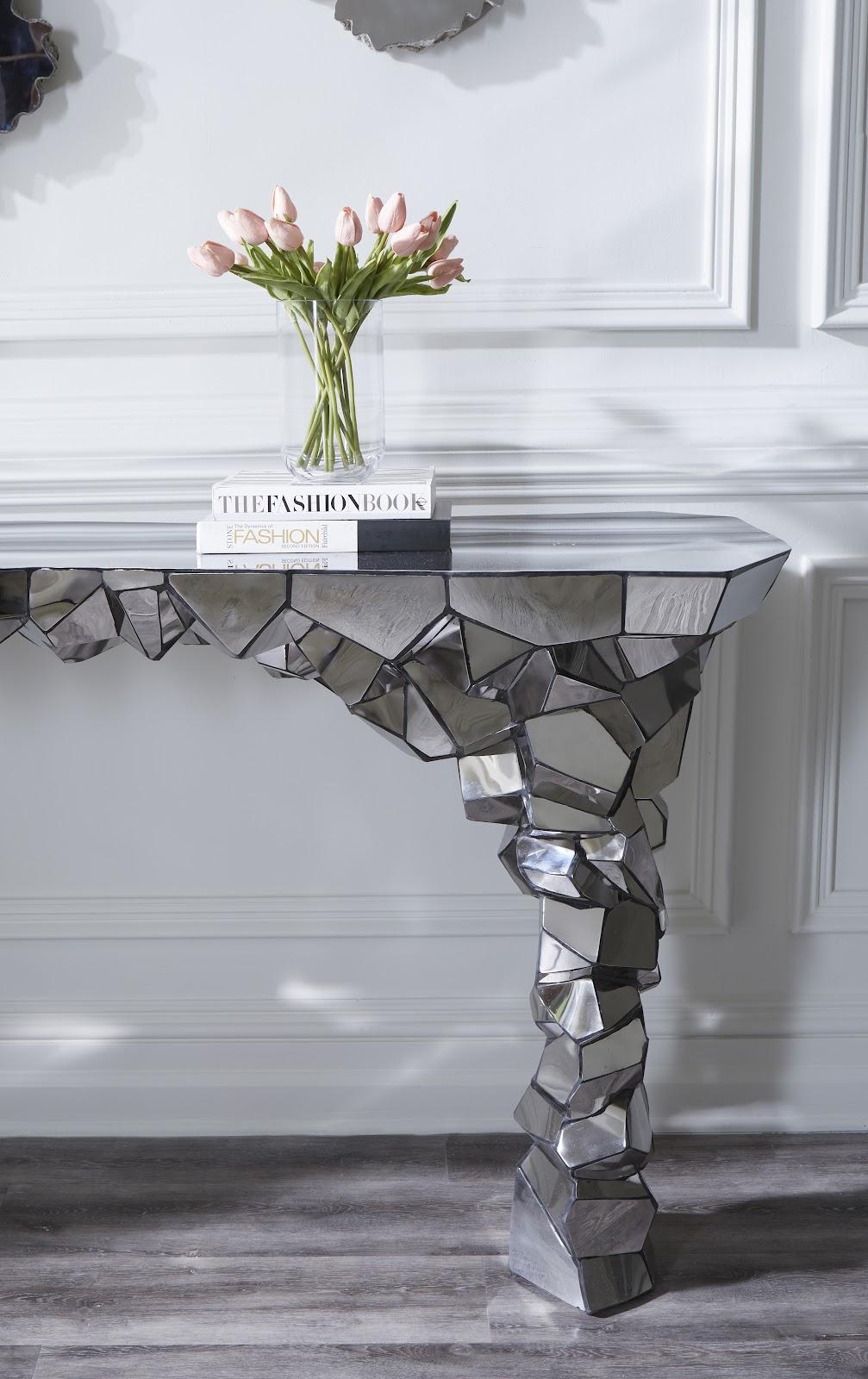 Description removeElegance incarnate, the Crazy Cut Console Table is a masterclass in the translation of organic curvature to modern materials. Evocative of a natural rock formation, the table is constructed with resin and enveloped in cuts of gleaming stainless steel that are delicately placed by hand. This generously sized showstopper will become a commanding presence in your space, introducing a unique blend of contemporary asymmetry that forges a path for the rest of your decor to follow. The Crazy Cut Collection contains many statement pieces that will steal the show in your future design projects, with each piece representing the textbook definition of the Phillips Collection ethos: modern organic.Notice keyboard_arrow_downThis item is made from polished stainless steel and is reflective like a mirror. Color will be determined by its surroundings. Note that the photo was taken in a white space, so color appears light and uniform in this case.