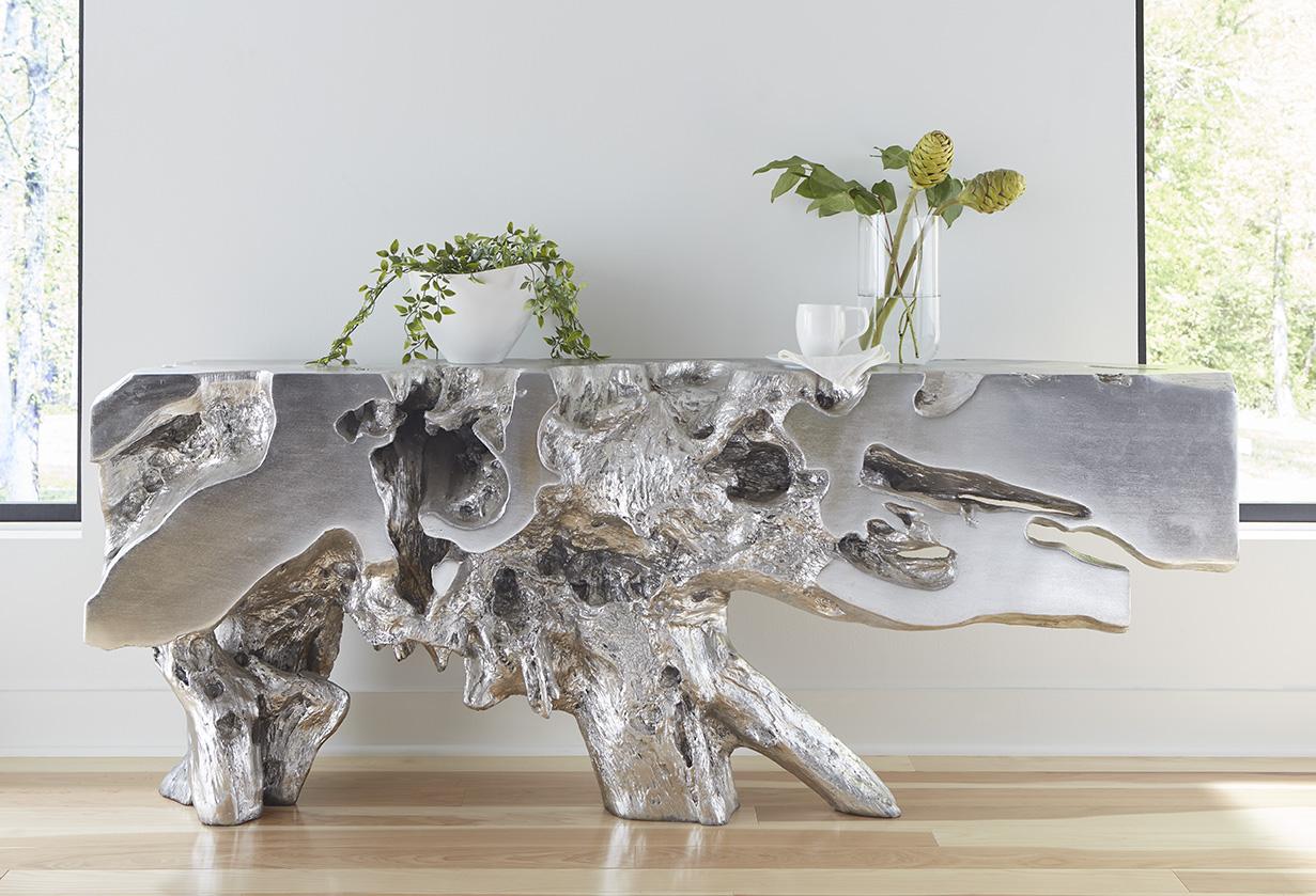 Description removeWhen we spot a shape that blows us away, the designers at Phillips Collection are not shy about bringing a bit of bling to elemental symbols we see in the woods. Case in point is our Freeform Large Silver Console Table, which is made of composite in a luminous silver leaf finish. Cast from one of our favorite Origins pieces of wood, this tree-trunk console table personifies our ethos of modern organic. By treating the surface of this log console table to such a brilliant finish, we’ve created a chic piece for contemporary interiors. Just imagine how perfectly it will fit into the décor of a modern apartment or a sleek coastal condo! We also offer the table in several sizes and in a number of finishes that are equally stunning.Notice keyboard_arrow_downThe silver leaf finish applied to our products is known for its luxurious metallic appearance. However, this finish can be susceptible to scratching if not handled carefully. Silver leaf is a delicate material; abrasions may occur during routine use or contact with abrasive surfaces.