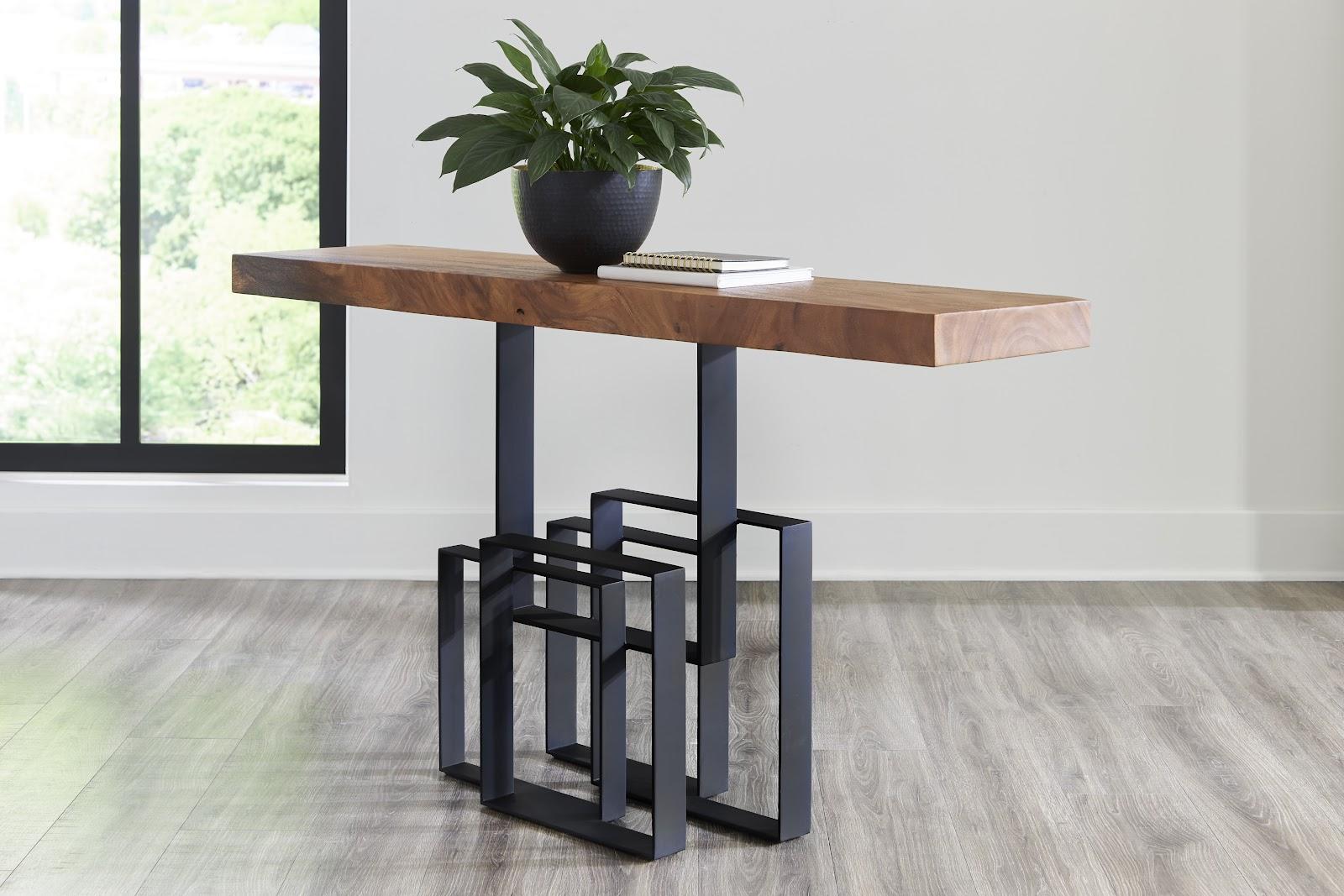 Description removeSolid Chamcha Wood tops are paired with rusted metal bases formed by various sized squares. This cool console table is unique and fun.Notice keyboard_arrow_downThis piece is crafted from natural solid wood.