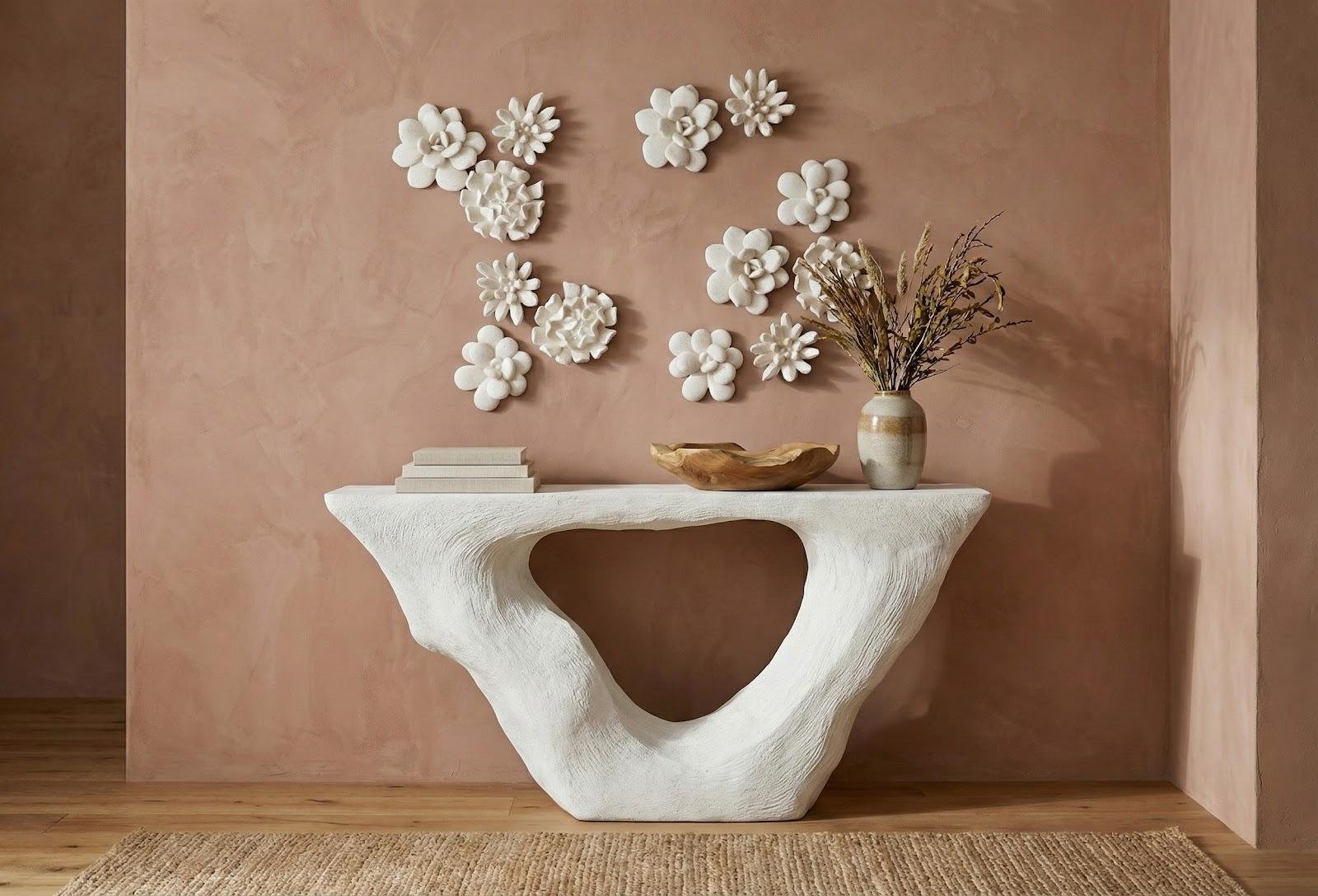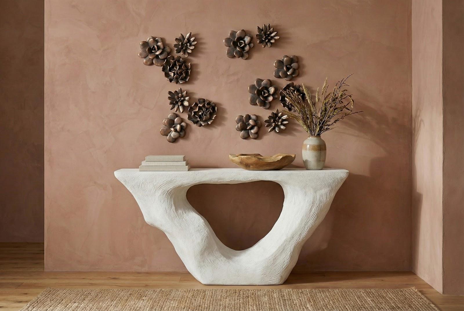 Description removeThe Strata Console captures the drama of nature’s raw edges, sculpted into a bold modern form. Crafted from resin with crushed stone, it features a carved opening that brings lightness to its monolithic silhouette. Finished in our softly weathered Roman Stone, the surface reveals layers of pale, chalky texture reminiscent of timeworn limestone. The result is a striking statement piece that bridges art and function with effortless style.Notice keyboard_arrow_downOur Roman Stone finish is crafted using a unique blend of crushed stone and resin, backed by a durable fiberglass structure. As a result of this artisanal process, hairline cracks may naturally appear in the surface. These fine lines are an expected characteristic of the material and do not compromise the strength, stability, or structural integrity of the piece. They are not considered defects or damage. Each item reflects the handcrafted nature of the Roman Stone finish, adding to its individual charm and timeless appeal.