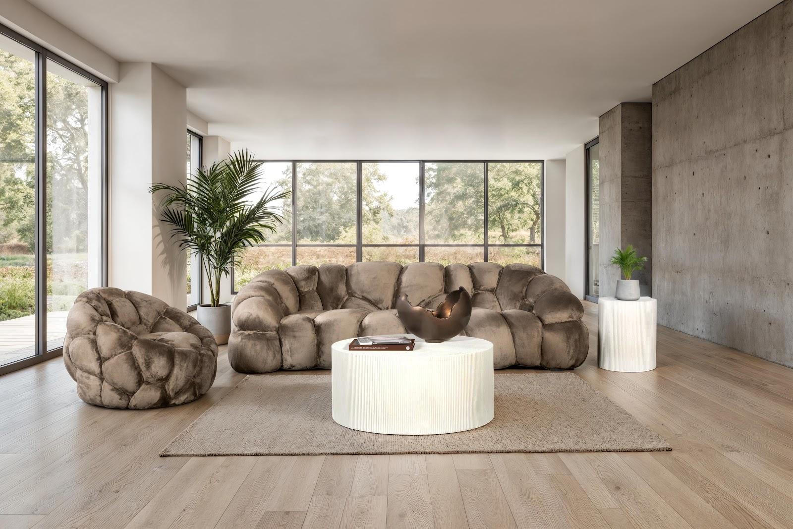 Description removeCozy never looked so sculptural. The Conrad Sofa blurs the line between furniture and art. With its pebble-like tufts and plush Lush Beige fabric, each cushioned form creates a soft, quilted landscape that offers unexpected comfort and undeniable visual impact. Upholstered in Lush Beige polyester, it offers a balance of soft comfort and bold visual appeal. A true conversation piece that brings softness, depth, and organic form into any living space.