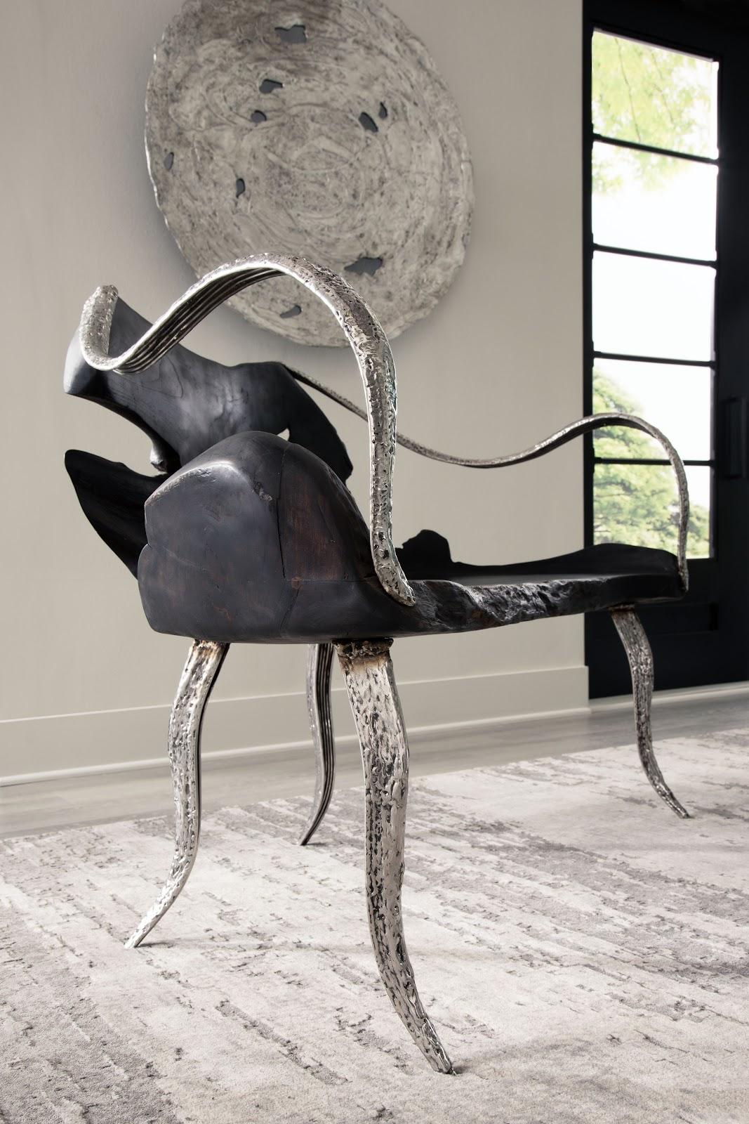Description removeOur Graven Live Edge Chair is a twist on organic modern design. Made from reclaimed teak wood hand finished in a lighten black with whimsically sculptured stainless steel legs. Each chair will be uniquely different due to variations nature has given us. Pair two of these together in your space and it will feel as if you are sitting on a throne back in ancient times.