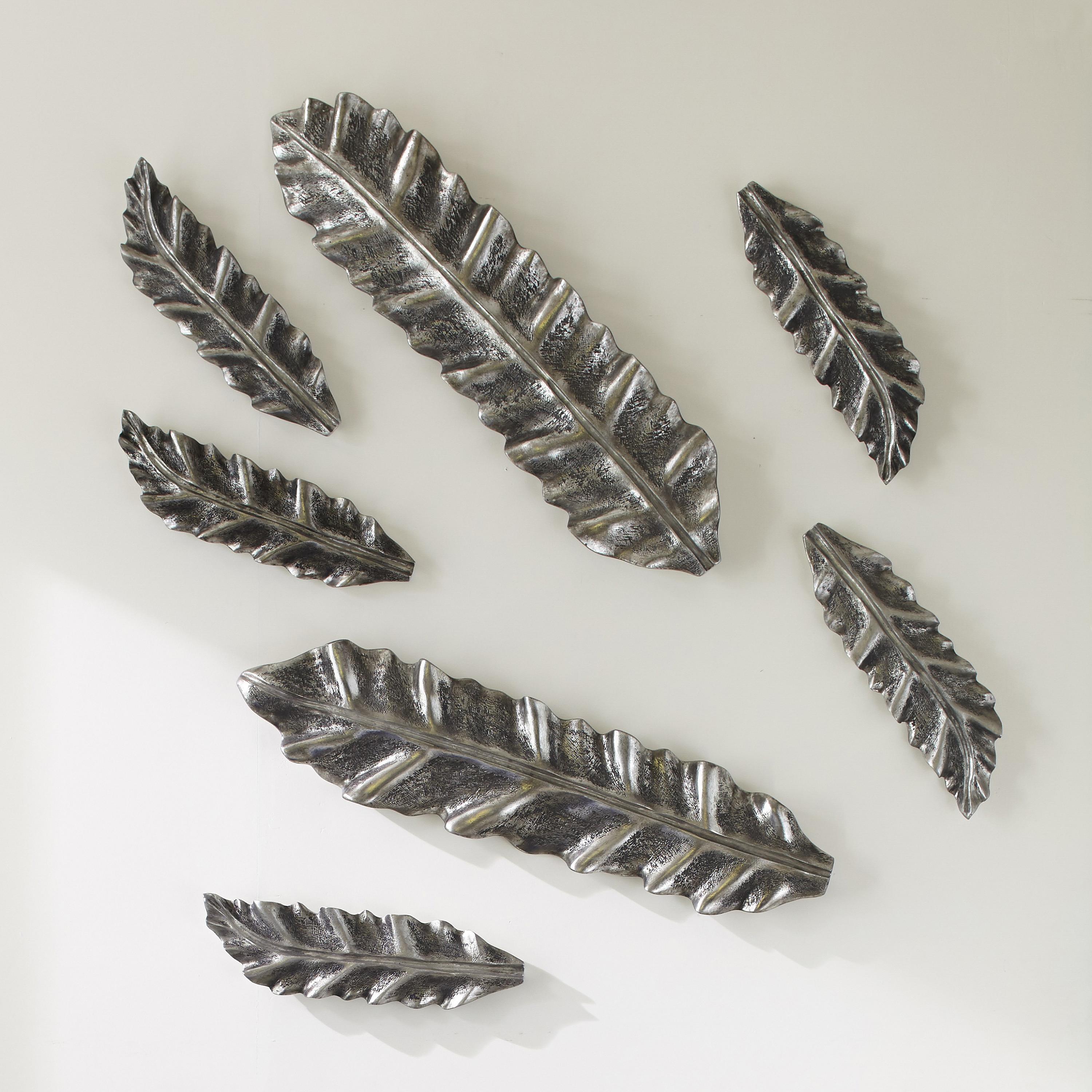 Description removeStatuesque walls demand lofty ornamentations and we created the Petiole Small Silver Wall Leaf A for those whose rooms have high ceilings because they are perfect for creating large gallery wall installations. Made of composite in a silver leaf finish, this is one of our decorative wall sculptures that illustrates the talents of our finish artisans who create luster and depth by how they apply the coating. We offer the Petiole leaf sculptures in several styles and finishes, all of which reflect the ethos that the Phillips Collection personifies: modern organic.Notice keyboard_arrow_downThe silver leaf finish applied to our products is known for its luxurious metallic appearance. However, this finish can be susceptible to scratching if not handled carefully. Silver leaf is a delicate material; abrasions may occur during routine use or contact with abrasive surfaces.