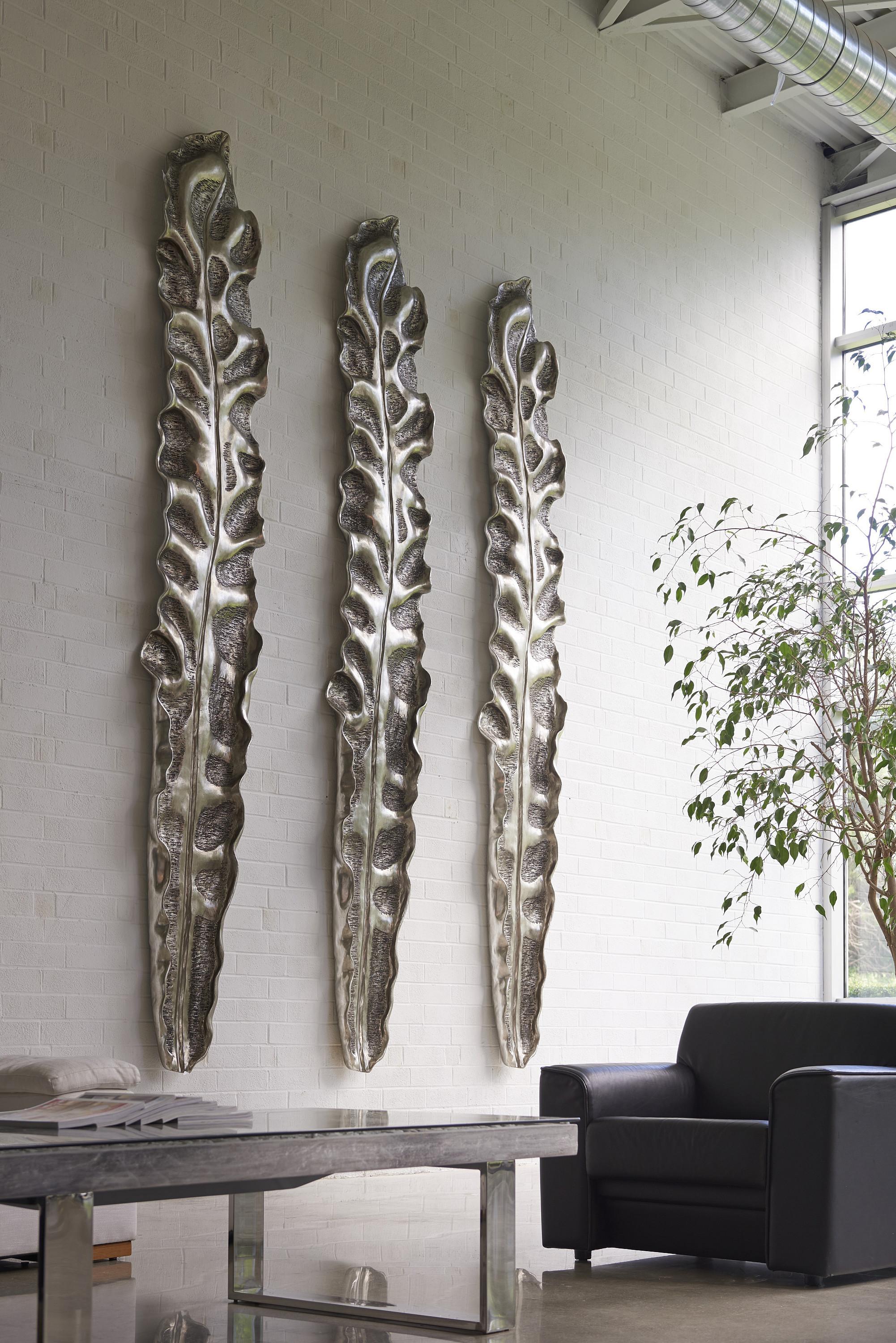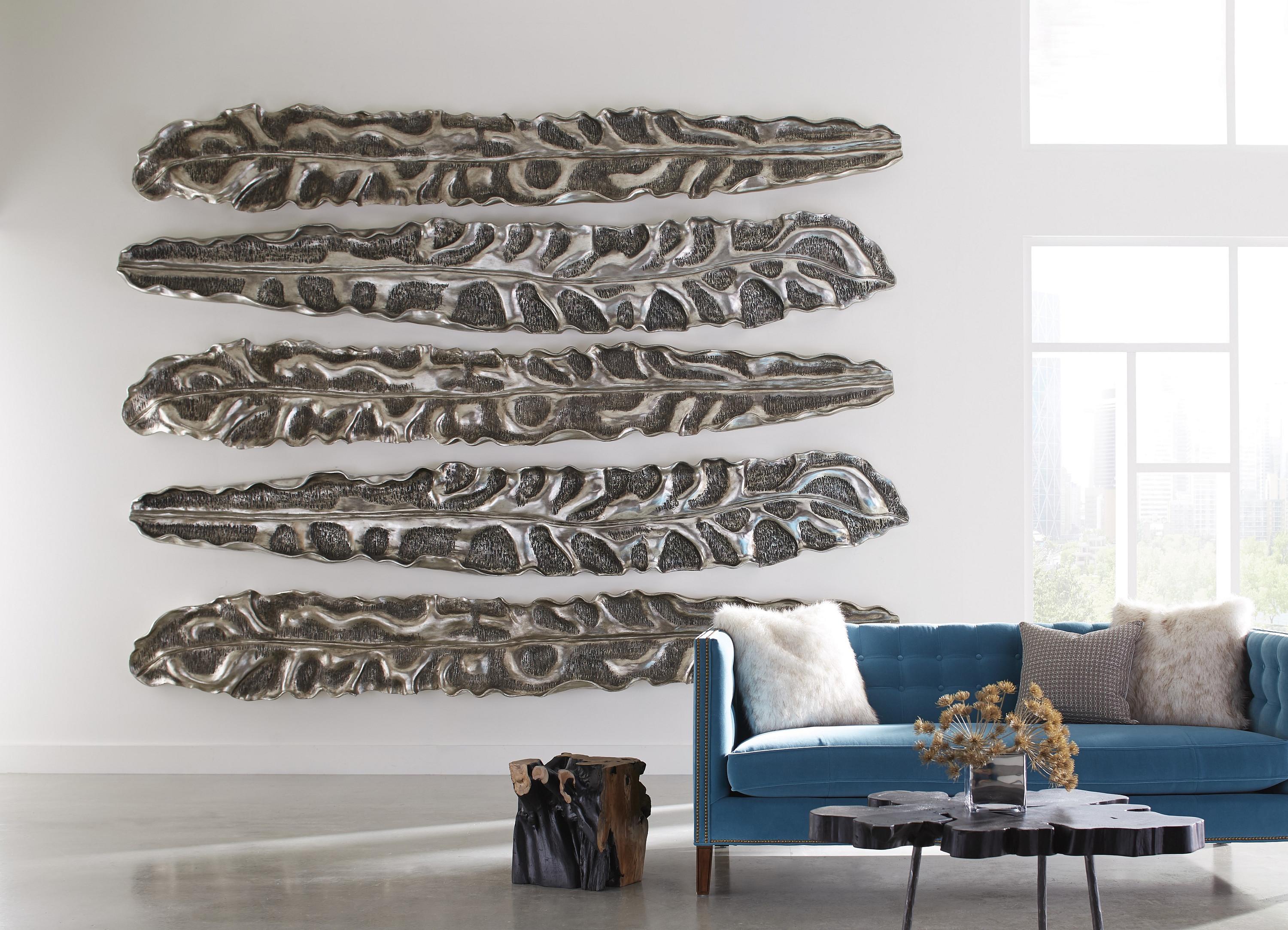 Description removePetiole Wall Leaves will not leave you disappointed. These leaves are crafted from artisan-grade resin making them lightweight for the wall and are hand finished in silver leaf for a glamorous effect. The exquisite detailing and dramatic scale of the Petiole Leaves will give you that wow factor you have been missing. Available in 4 styles and 2 sizes, including a 160 inch colossal.Notice keyboard_arrow_downThe silver leaf finish applied to our products is known for its luxurious metallic appearance. However, this finish can be susceptible to scratching if not handled carefully. Silver leaf is a delicate material; abrasions may occur during routine use or contact with abrasive surfaces.