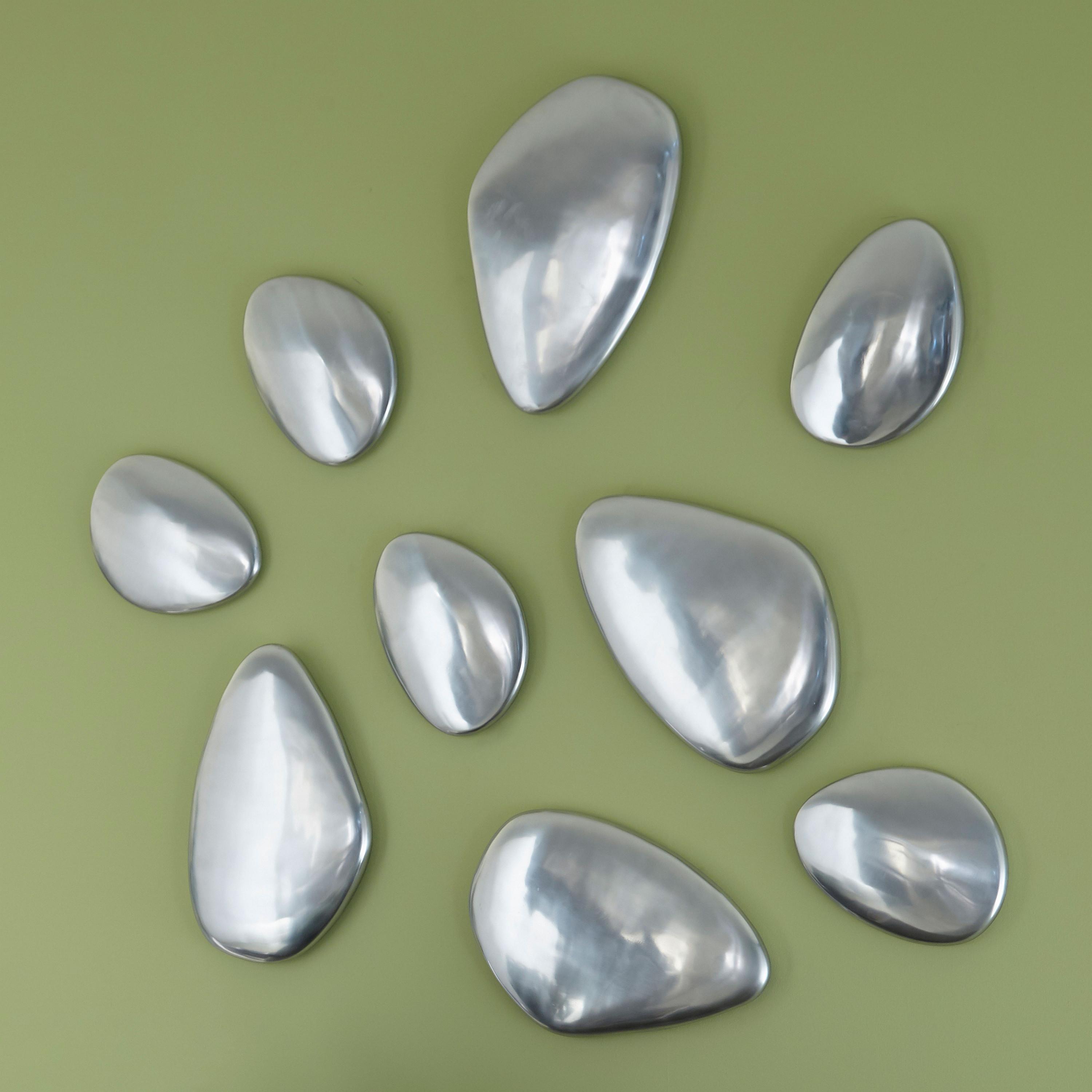 Description removeThere is something mesmerizing about the power of water and how it softens rock into a water-worn stone. Inspiration in Nature's ability to shape a hard surface into something beautiful when he envisioned the River Stone collection. Made of metal in a brilliant silver color, these decorative wall sculptures are one of many products we offer in this collection, each of which reflects the ethos that Phillips Collection personifies: modern organic.