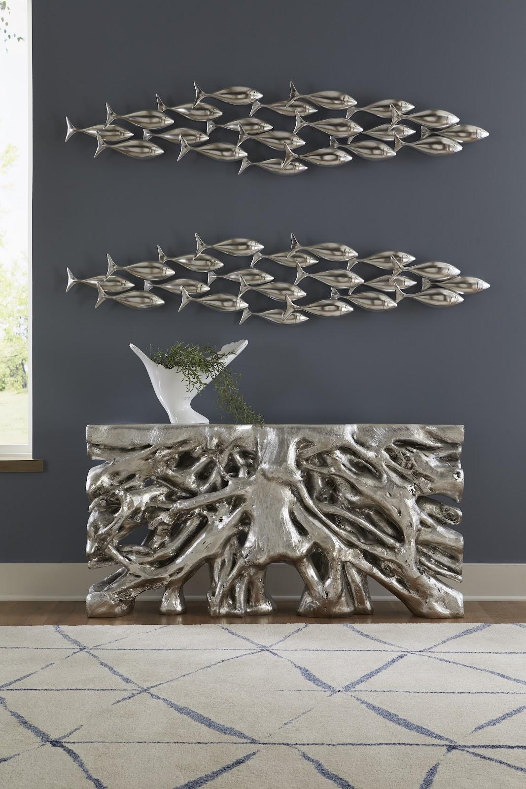 Description removeA school of fish is greater than the sum of its parts, accomplishing more together than any single fish could do alone. This demonstration of teamwork and unity inspired the Silver School of Fish Wall Art from Phillips Collection. Made from artisan-grade resin and finished in silver leaf, this playful piece of dimensional wall decor features twenty fish hanging from various lengths from the wall that lends an element of depth to the piece.Notice keyboard_arrow_downThe silver leaf finish applied to our products is known for its luxurious metallic appearance. However, this finish can be susceptible to scratching if not handled carefully. Silver leaf is a delicate material; abrasions may occur during routine use or contact with abrasive surfaces.