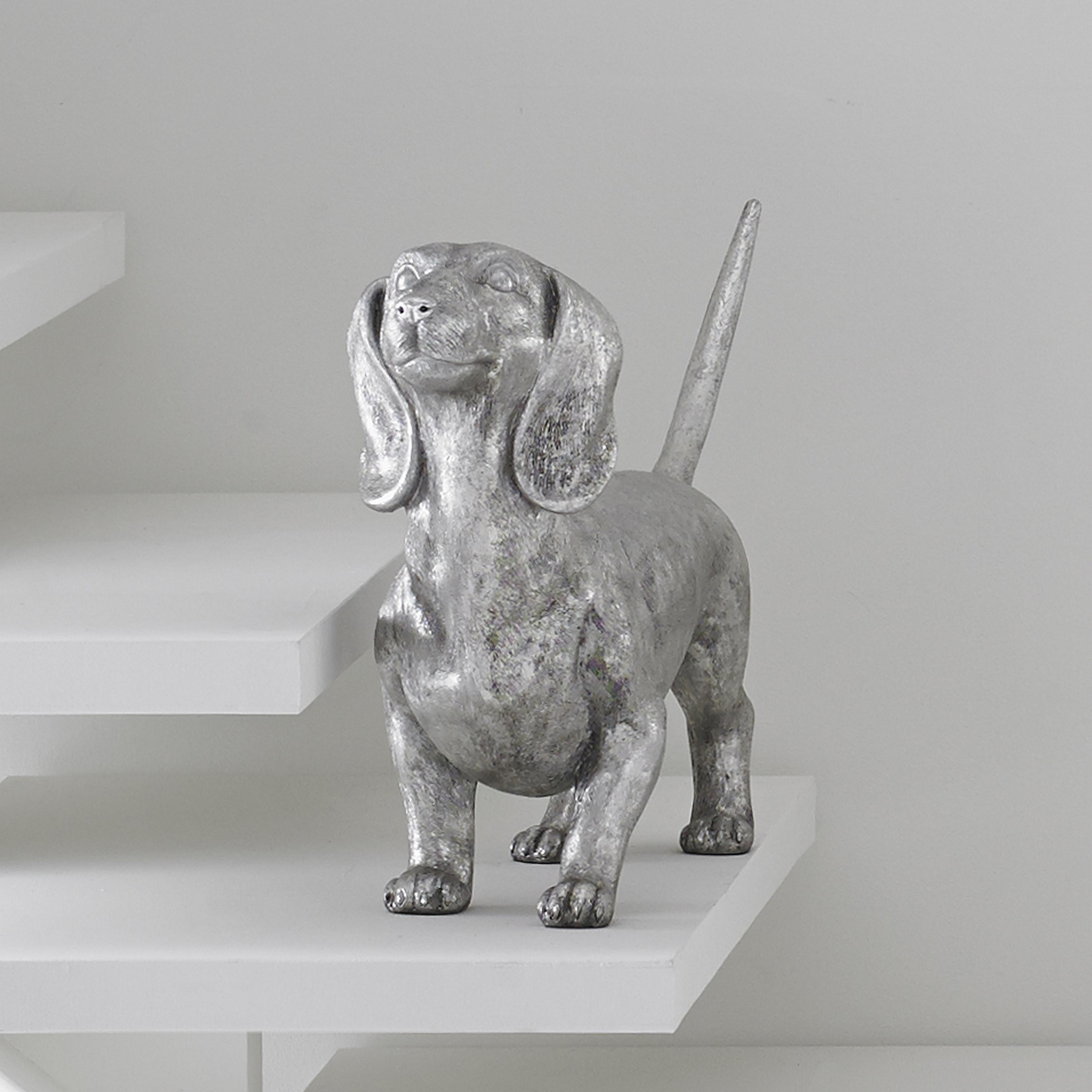 Description removeCast in artisan-grade resin and hand finished in silver leaf, this realistic canine make a glamorous pet.Notice keyboard_arrow_downThe silver leaf finish applied to our products is known for its luxurious metallic appearance. However, this finish can be susceptible to scratching if not handled carefully. Silver leaf is a delicate material; abrasions may occur during routine use or contact with abrasive surfaces.