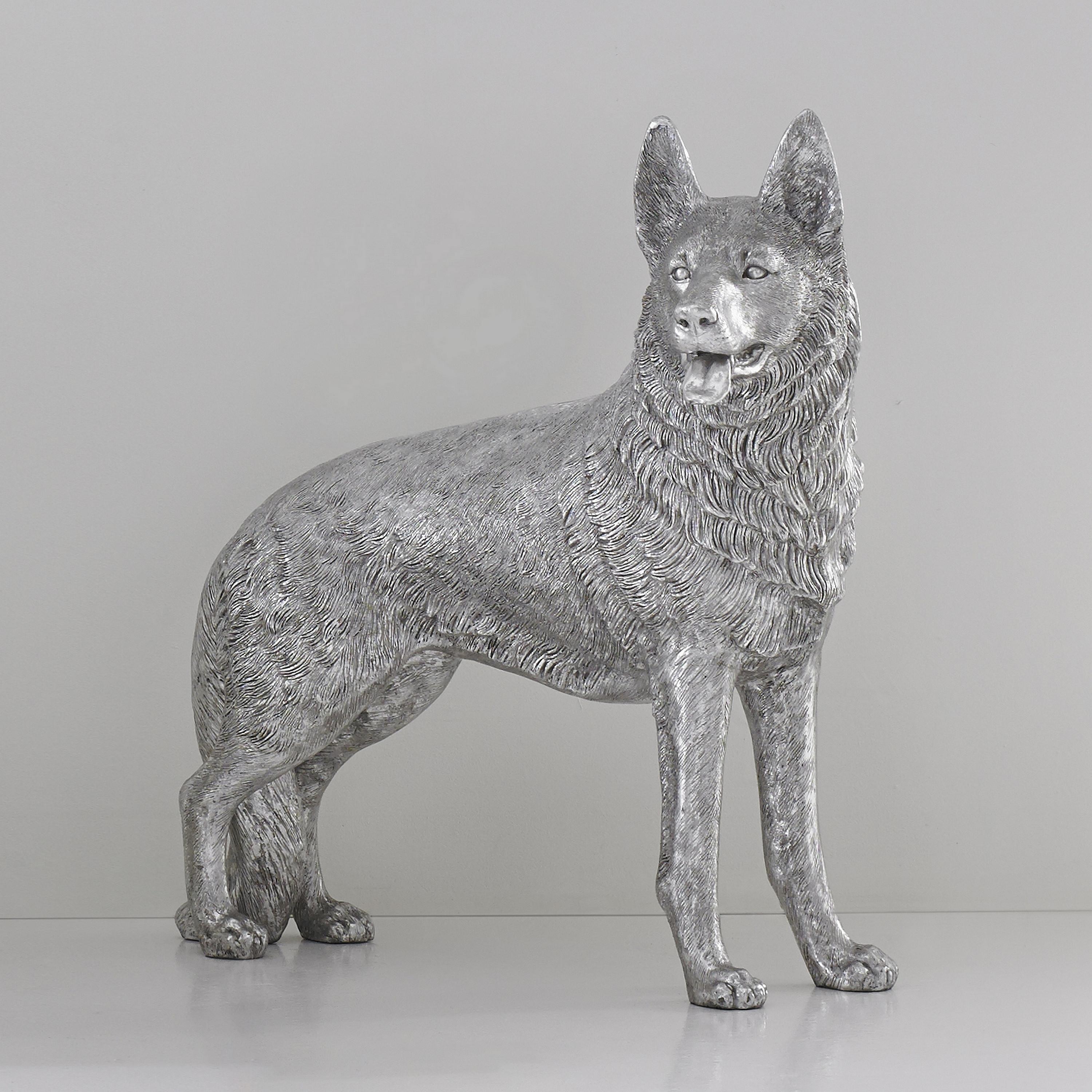 Description removeThe fact that it is both playful and powerful makes our Standing German Shepherd Dog Sculpture a paradoxical decorative accessory. Ears perked and expression attentive, it’s man’s best friend without the hassle of maintenance! A true artisanal piece, the decorative dog sculpture is made of aluminum in a variegated finish in which black and silver bring it added patina. We offer many similar sculptures in a number of dog breeds. Each of these reflects the ethos that Phillips Collection personifies: modern organic.Notice keyboard_arrow_downThe silver leaf finish applied to our products is known for its luxurious metallic appearance. However, this finish can be susceptible to scratching if not handled carefully. Silver leaf is a delicate material; abrasions may occur during routine use or contact with abrasive surfaces.