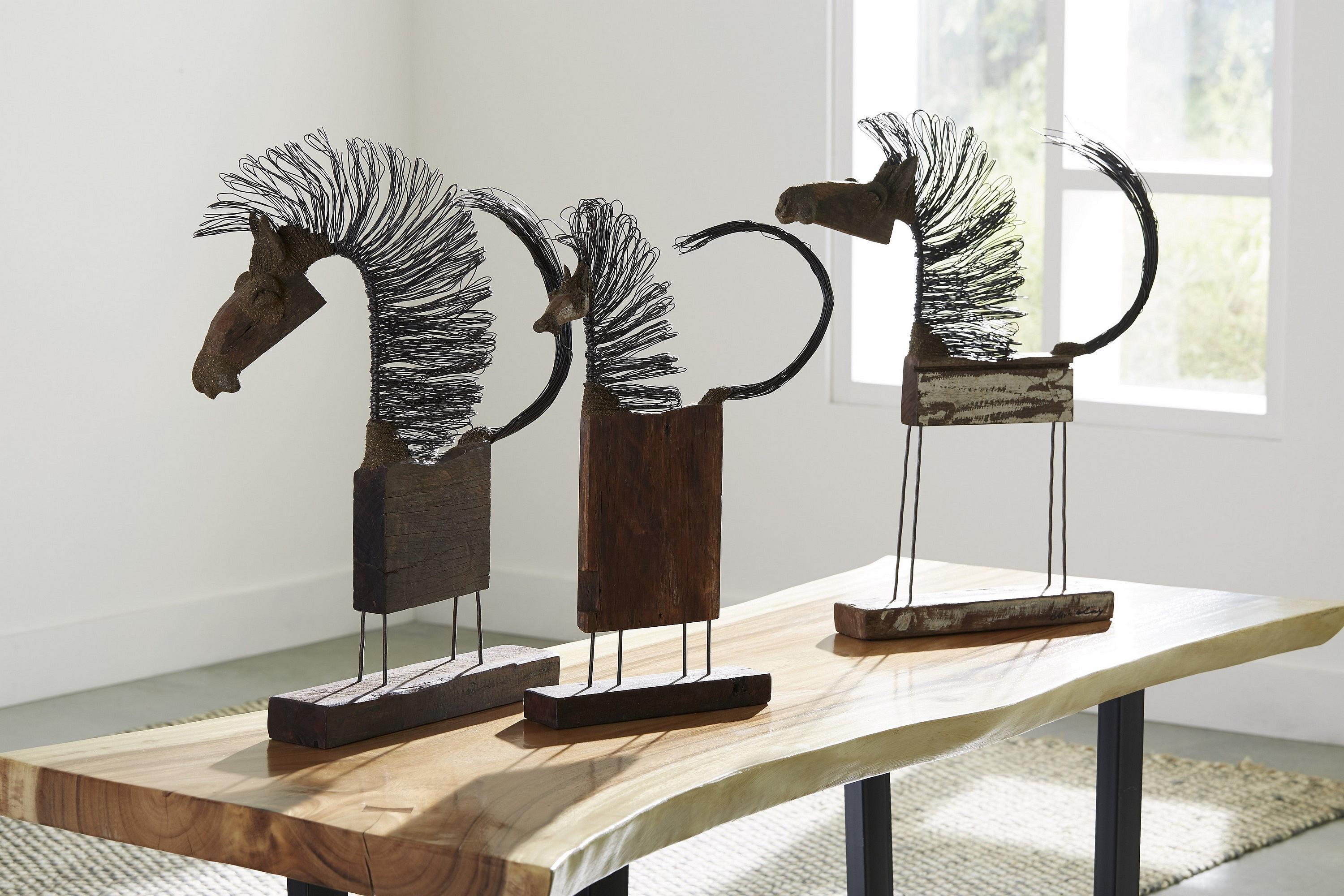 Description removeFilled with whimsy, the Wire Horse Collection, designed by Thai artist Chin Clay, is completely hand-crafted and has his signature on every piece. The wood is reclaimed and the wire is recycled, which personifies the Phillips Collection ethos of modern organic. We offer a number of versions of this wood and metal sculpture that includes the Small-Body Wire Horse Sculpture. We're certain there's one that will speak to almost anyone for adding a true conversation started to a space.Notice keyboard_arrow_downThis piece is crafted from natural solid wood. Color and character of wood grain may vary, adding a unique character to your piece.