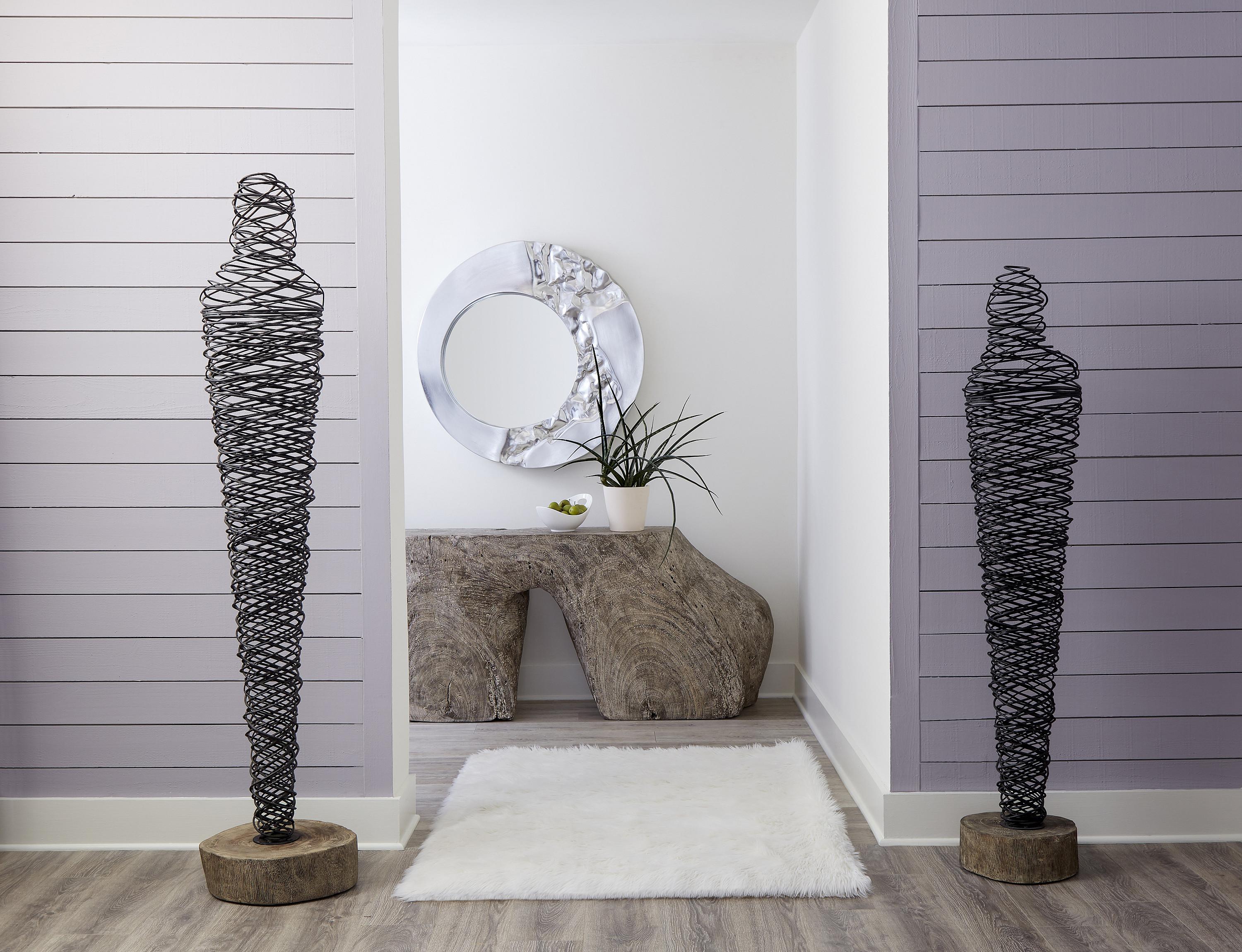 Description removeAbstracting the human form has been a fascination for artists since burnt sticks created charcoal that was used to draw on cave walls. Our artisans have created our own industrial chic version with the Small Abstract Wire Man Floor Sculpture. At 68-inches tall, the mummy-like shape packs an edgy wallop. It takes great patience and skill to bend wire so fluidly, particularly when the results are so contemporary, which makes this metal sculpture perfect for the Phillips Collection ethos of modern organic. We offer this design in a larger size.