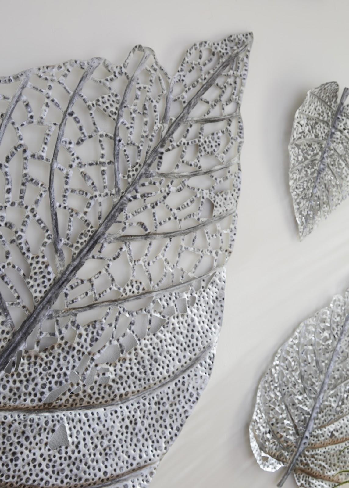 Description removeCreating an intricacy that was once the domain of Mother Nature, our design team and artisans have become adept at bringing sophisticated wall art to the home décor market. Many of our pieces, like the Extra Large Birch Leaf Wall Art, hang in relief to create depth and a highly refined shadow quality. This example of the waning season of fall has been hand-cut from metal sheets and dressed in silver with a satin finish. Colossal in scale yet simple to mount, there are multiple sizes in this series, which makes them perfect for grouping. The cold metallic hues on and the textural character of these birch leaves reflect the ethos that Phillips Collection personifies: modern organic.
