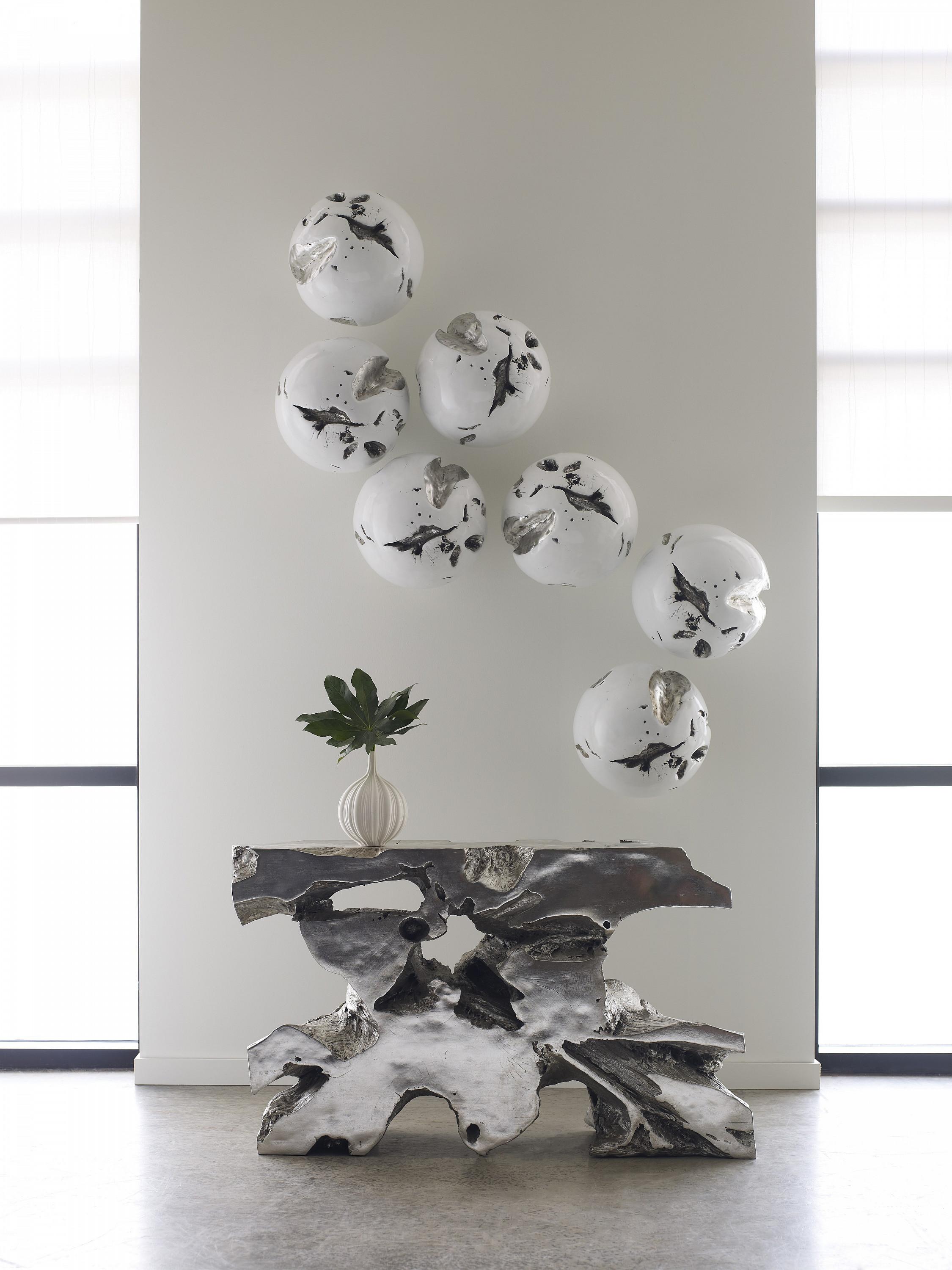 Description removeMade of composite in a mix of silver leaf and glossy lacquered white finishes, the Medium White Cast Root Wall Ball is the blingy cousin to the wood pieces we offer. It has been molded in this modern material into exact replicas of the ones honed from felled root balls, though it is far cooler, as the contemporary slickness of the finishes means it is a perfect white and silver sculpture for pared-down spaces. We also offer it in this color combination in small and large sizes.Notice keyboard_arrow_downThe silver leaf finish applied to our products is known for its luxurious metallic appearance. However, this finish can be susceptible to scratching if not handled carefully. Silver leaf is a delicate material; abrasions may occur during routine use or contact with abrasive surfaces.