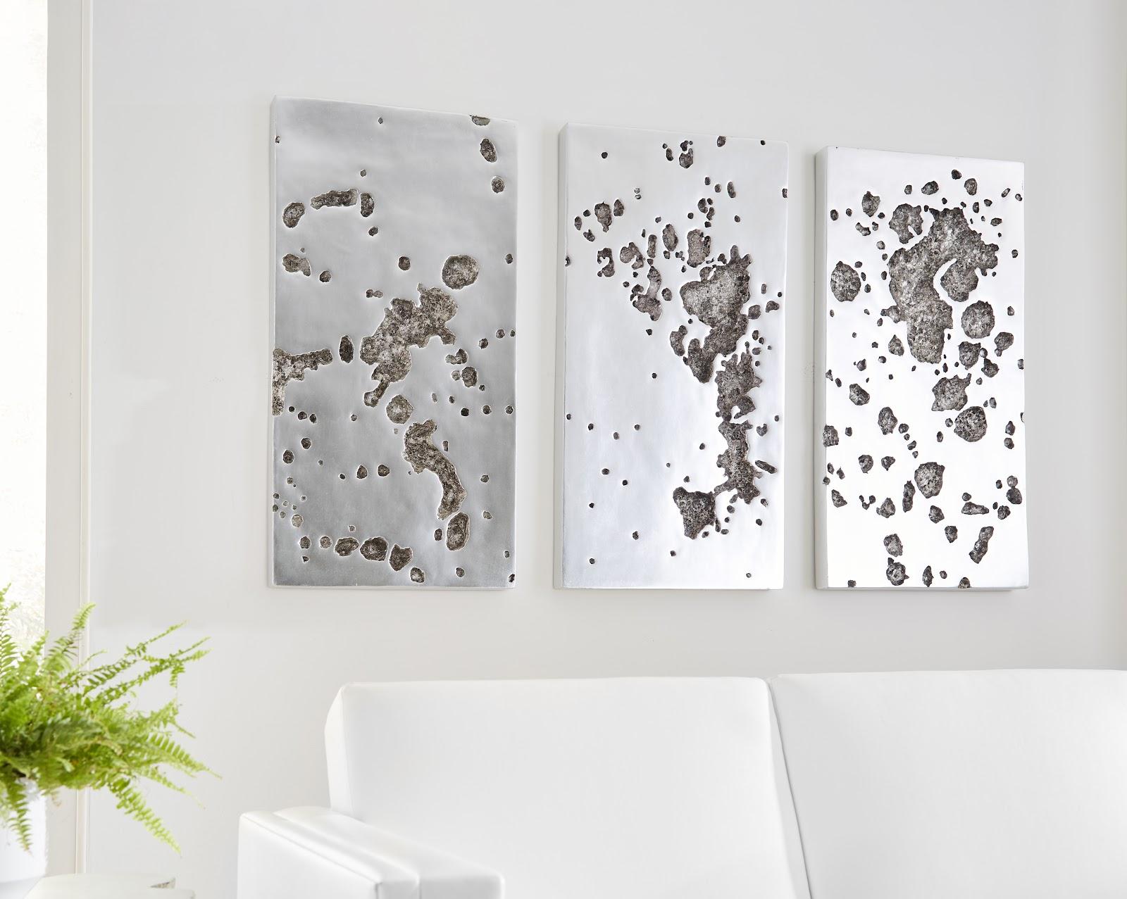 Description removeThe moon couldn’t have created surfaces as winsome as those on our Splotch series of decorative mirrors and wall art, which includes the Splotch Sparse Rectangular Silver Wall Art. Rather than molten metal creating the craters that flow along the tile, the decorative accent is made of composite in a silver leaf finish. We have a number of wall tiles in varying sizes and finishes in this family of accessories and we offer decorative mirrors in silver and gold. Each of these reflects the ethos that Phillips Collection personifies: modern organic.Notice keyboard_arrow_downThe silver leaf finish applied to our products is known for its luxurious metallic appearance. However, this finish can be susceptible to scratching if not handled carefully. Silver leaf is a delicate material; abrasions may occur during routine use or contact with abrasive surfaces.