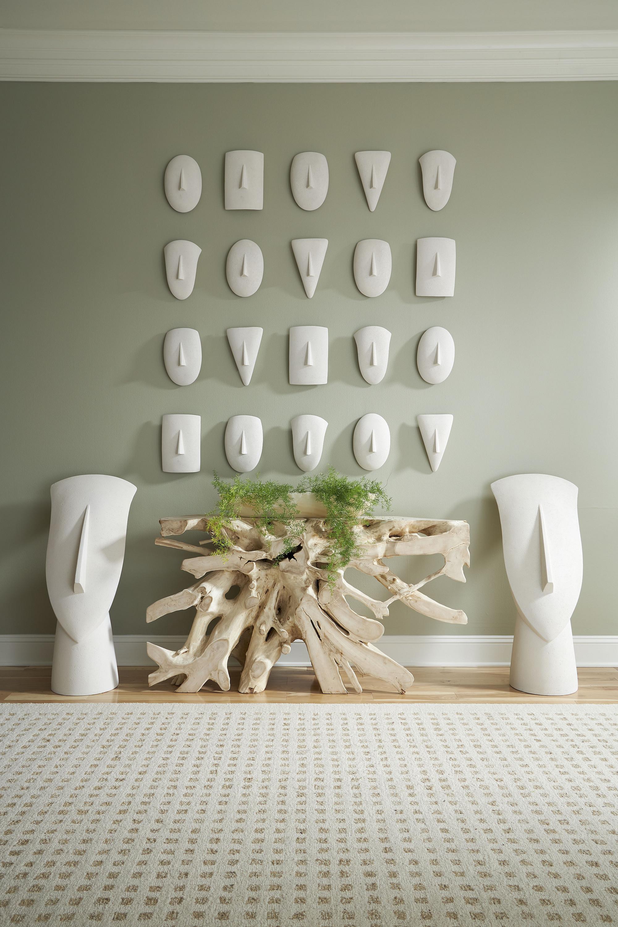 Description removeGreek Cycladic sculptures have long been seen as symbols of art with design elements from this era being particularly popular in the modern home. With a single line to signify the entirety of the face, Our Cycladic Wall Faces come in a set of 5 and each is a geometric minimal design. The faces are deeply expressive with their unique ability to capture the imagination; cast from artisan-grade resin and finished in our white stone finish. The simplicity of Cycladic Wall Faces is their main charm, and when displayed in your own space they become an expression of beauty and a conversation starter!Notice keyboard_arrow_downOur White Stone finish is crafted using a unique blend of crushed stone and resin, backed by a durable fiberglass structure. As a result of this artisanal process, hairline cracks may naturally appear in the surface. These fine lines are an expected characteristic of the material and do not compromise the strength, stability, or structural integrity of the piece. They are not considered defects or damage. Each item reflects the handcrafted nature of the White Stone finish, adding to its individual charm and timeless appeal.