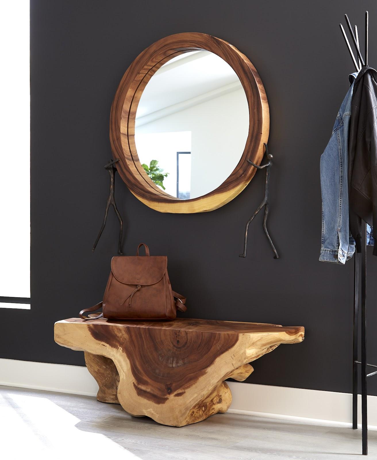 Description removeThe Atlas Natural Mirror is a round decorative mirror made of chamcha wood ornamented with whimsical metal figures in a bronze finish. The Atlas Collection, which reflects the ethos that Phillips Collection personifies—modern organic—has a storied namesake. In Greek mythology, Atlas was the Titan god of endurance whom Zeus tasked with holding up the celestial heavens for eternity. With exquisite craftsmanship, we have rescued the reclaimed chamcha wood top from being one of Nature’s finest castaways by making it into an elemental design statement. We have two mirrors in this series, the other version in a gray finish.Notice keyboard_arrow_downCrafted by hand from natural acacia wood, there may be organic variations in the form of these wall pieces. Variations may include cracks, divots or imperfect edges.