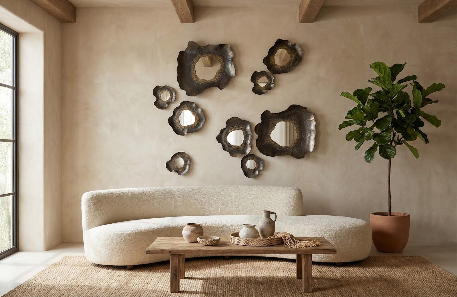 Description removeThe Bloom Mirrors Collection transforms simple metal sheets into sculptural works of art. Each mirror radiates outward with petal-like forms, capturing the organic energy of a bloom frozen in time. Available in three sizes, these mirrors bring dimension, texture, and a natural elegance to the wall. Designed to reflect both light and artistry, the Bloom Mirrors are striking on their own and even more impactful when displayed together.