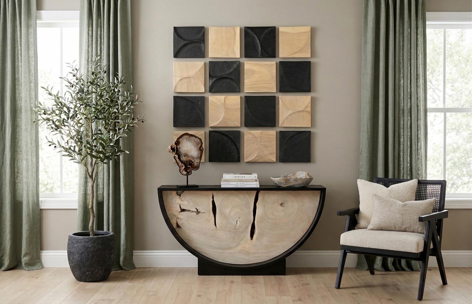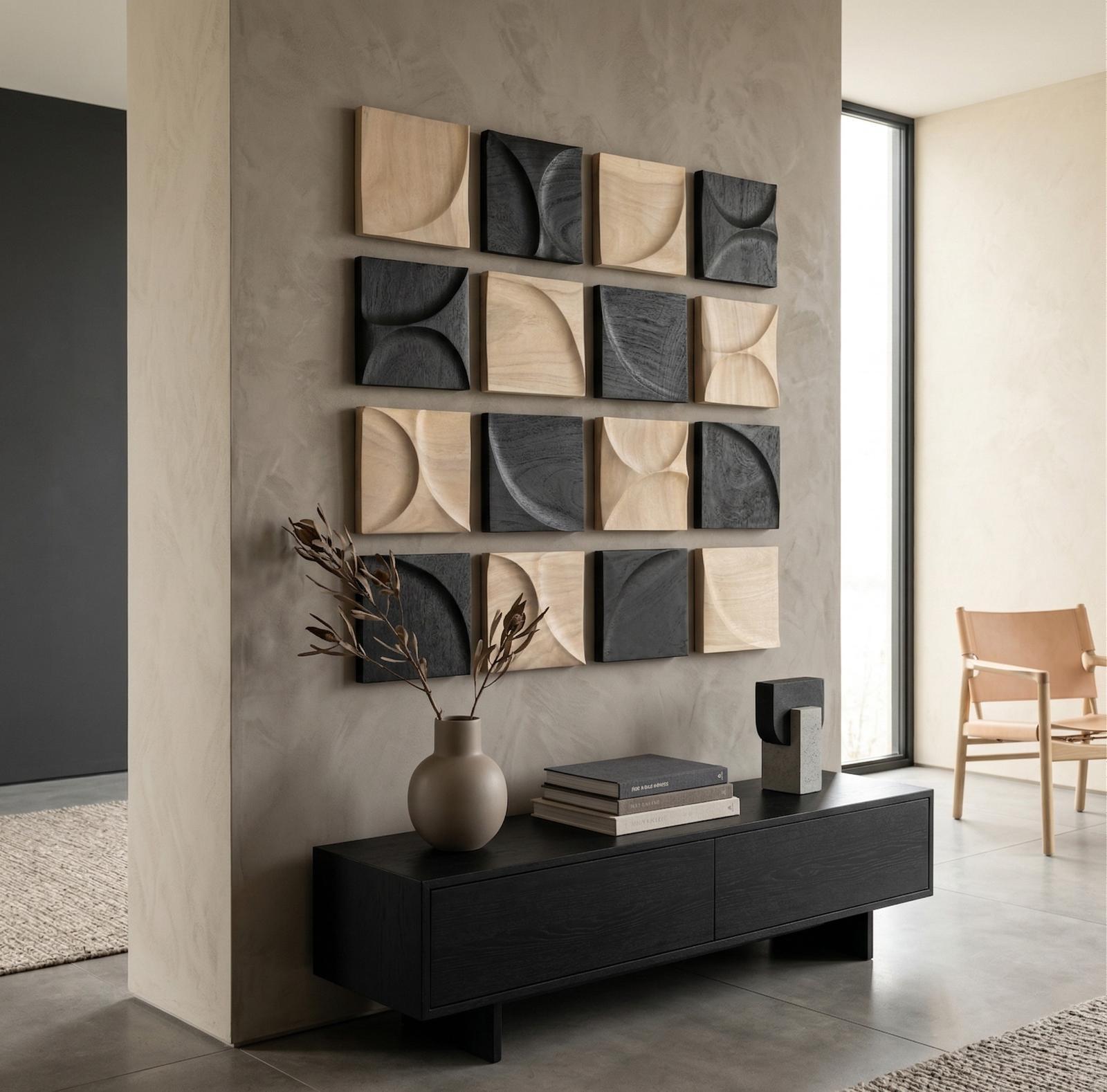 Description removeEach tile is a study in motion. Carved curves flowing through solid chamcha wood. Available in Arc and Wave designs, and in either Black or Bleach finishes, creating a visual language of shadow, shape, and silence. Grouped together or standing alone, they invite both touch and contemplation.Notice keyboard_arrow_downThis piece is crafted from natural solid wood. Color and texture in wood will vary and natural holes and subtle openings add unique character to your piece. Wood "breathes" and it is normal for cracks to present themselves over time. This is NOT considered a defect.