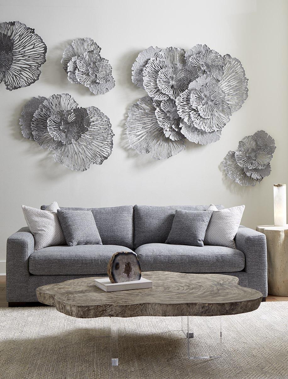 Description removeThe lacy artistry of the Medium Gray Flower Wall Art will make a dramatic statement on its own; arrange it alongside a variety of different sizes in the same good-looking gray, and you bring a room a massive dose of loveliness. The filigree effect of the profile, which is cut from metal and powder coated for a rich, lasting finish, will throw textural shadows on surrounding surfaces that will evolve with the movement of the sun. If gray is not the perfect color for a space, we offer the floral wall sculptures in a number of colors, from copper, blue and yellow to red, black and ivory. Each of the offerings in this collection reflects the ethos that Phillips Collection personifies: modern organic.Notice keyboard_arrow_downThe metal used in this piece is malleable and can be maneuvered to fold out from the wall more or less, thus changing the overall dimensions. The user can make adjustments on site if a different depth is desired. Please note the hardware on the back of the piece is security hardware ready mounting brackets.