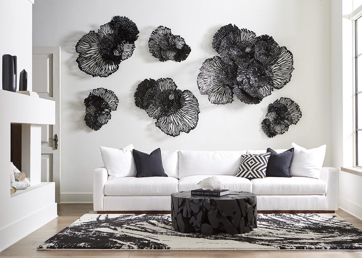 Description removeThe lacy artistry of the Small Black Flower Wall Art will make a dramatic statement on its own; arrange it alongside a variety of different sizes in the same chic black, and you bring a room a massive dose of loveliness. The filigree effect of the profile, which is cut from metal and powder coated for a rich, lasting finish, will throw textural shadows on surrounding surfaces that will evolve with the movement of the sun. If black is not the perfect color for a space, we offer the floral wall sculptures in a number of colors, from copper, blue and yellow to red, gray and ivory. Each of the offerings in this collection reflects the ethos that Phillips Collection personifies: modern organic.Notice keyboard_arrow_downThe metal used in this piece is malleable and can be maneuvered to fold out from the wall more or less, thus changing the overall dimensions. The user can make adjustments on site if a different depth is desired. Please note the hardware on the back of the piece is security hardware ready mounting brackets.