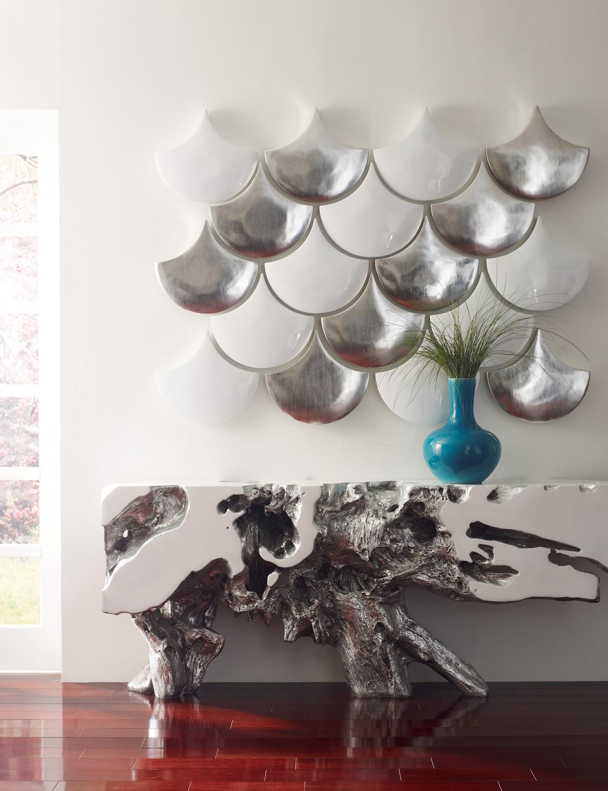 Description removeThe Scales White Wall Tile Set would read to the mind as a simple teardrop shape hung alone; when grouped the curvy decorative elements become fish scales—thus the name. Made of composite in a glossy white lacquer finish, these tiles are crisp design elements in any space, and they create a fun gallery wall installation when a number of sets are combined. We also offer the Scales in a silver leaf finish. Each of these sets of decorative wall art reflects the ethos that the Phillips Collection personifies: modern organic.