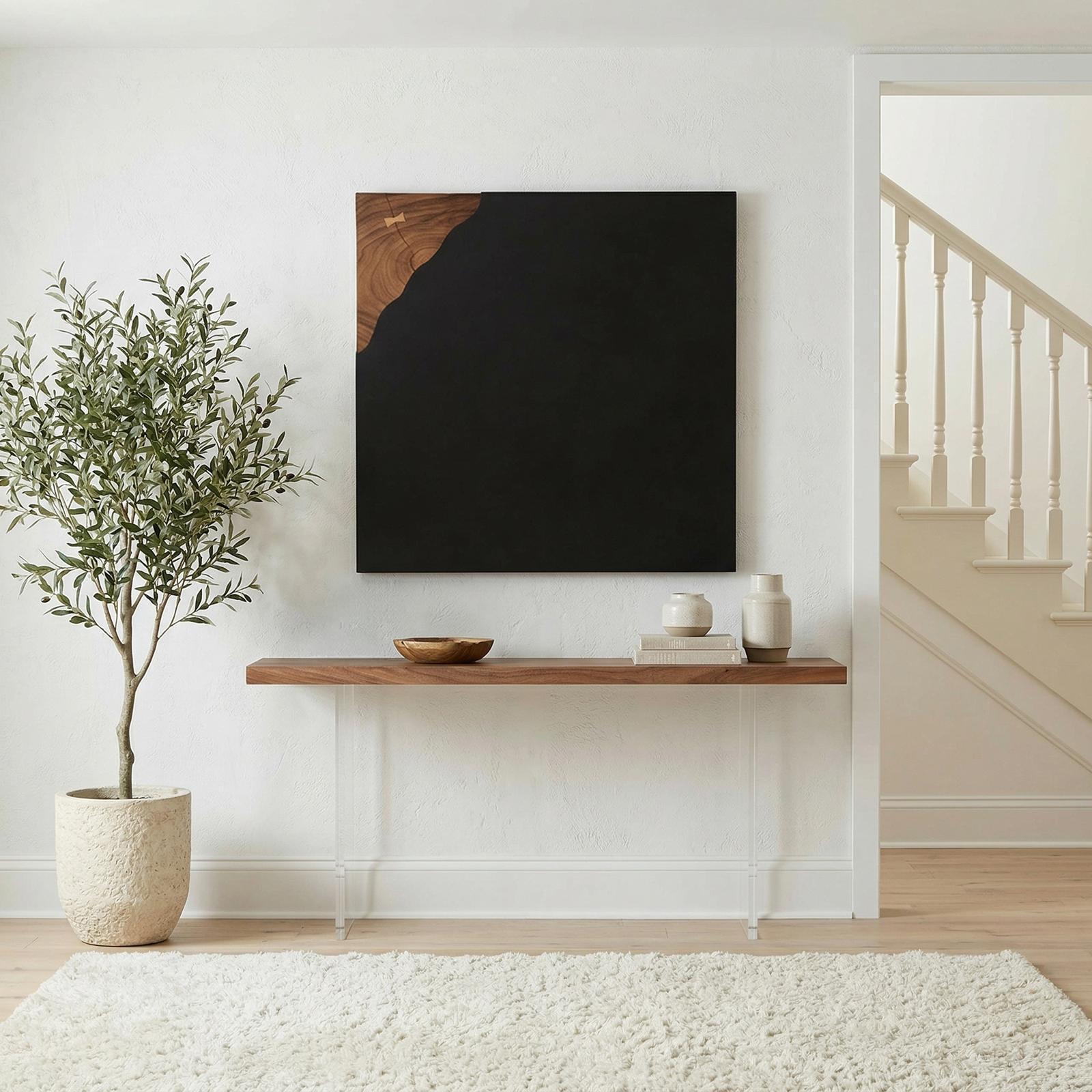 Description removeThe Cornered Wall Art is a sleek and sophisticated wall hanging made with black iron and bits of natural chamcha wood peeking out from the corner. The mixed media design is both eye-catching and functional. This piece is primarily made from iron making it lightweight and easy to move. Natural chamcha wood accents provide the perfect contrast to the stark black iron. Whether you're looking for a piece to complete your living room or just want to add a bit of luxury to your home, the Cornered Collection is sure to have what you're looking for. This collection also includes a console table, side table, coffee table, and more.Notice keyboard_arrow_downThis piece includes portions of natural solid wood. Color and texture in wood will vary and natural holes and subtle openings add unique character to your piece. Wood "breathes" and it is normal for cracks to present themselves over time. This is NOT considered a defect.