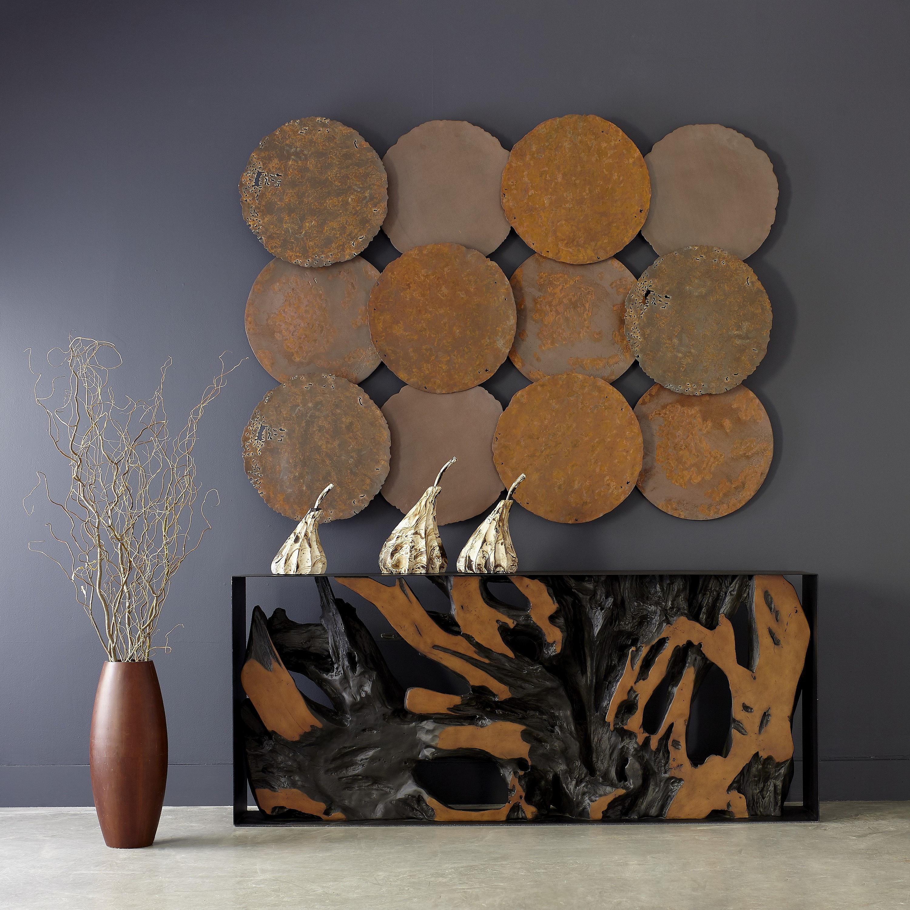 Description removeInspired by our jaunts overseas where oil drums in varying stages of deterioration greeted us at every turn, we created our own replicas of the discs carved from the tops (or bottoms) as edgy decorative elements. Though the patina we achieved with our rust finish may convince you that these are made of metal, the Rust Cast Oil Drum Wall Discs, which are packaged as a set of four, are made of composite that our finish artisans made to look convincingly old. This set of circular wall art is the perfect representation of the Phillips Collection ethos: modern organic. We also offer the discs in gold leaf, silver leaf, liquid gold, and liquid silver.Notice keyboard_arrow_downCast in resin from a rusted oil drum, each set of 4 will be the same in size, style, and color. Holes, imprinted writing and other details will look as shown in the photos.