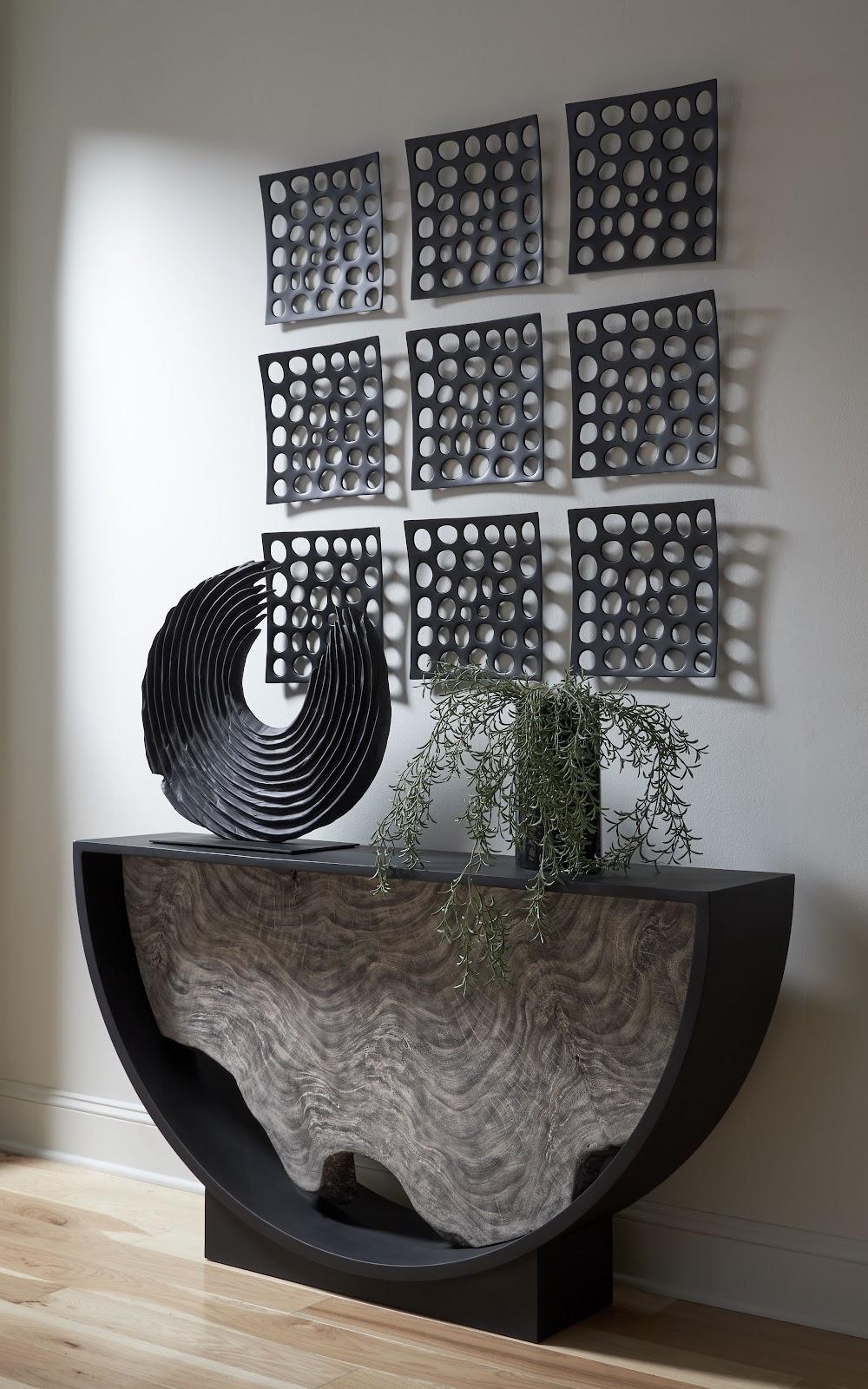Description removeSlightly irregular holes are hand-crafted and made from resin to create our Black Polka Dot Wall Tile, which was affectionately named for the array of openings. An interesting design element of note is how the tile bends slightly out from the wall, which creates a shadowy effect that moves along the wall with the progress of natural light. These black sculptures look smashing hung in a gallery installation, the textural interplay of their surfaces worthy of an accent wall arrangement. The looseness of the pattern and the contemporary feel of this decorative element makes this ideal for the modern organic ethos for which Phillips Collection is renowned.